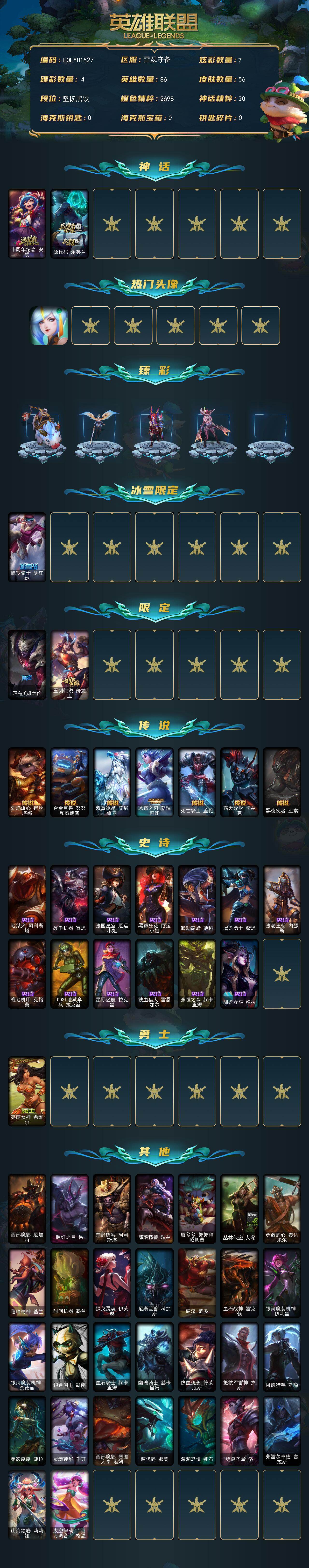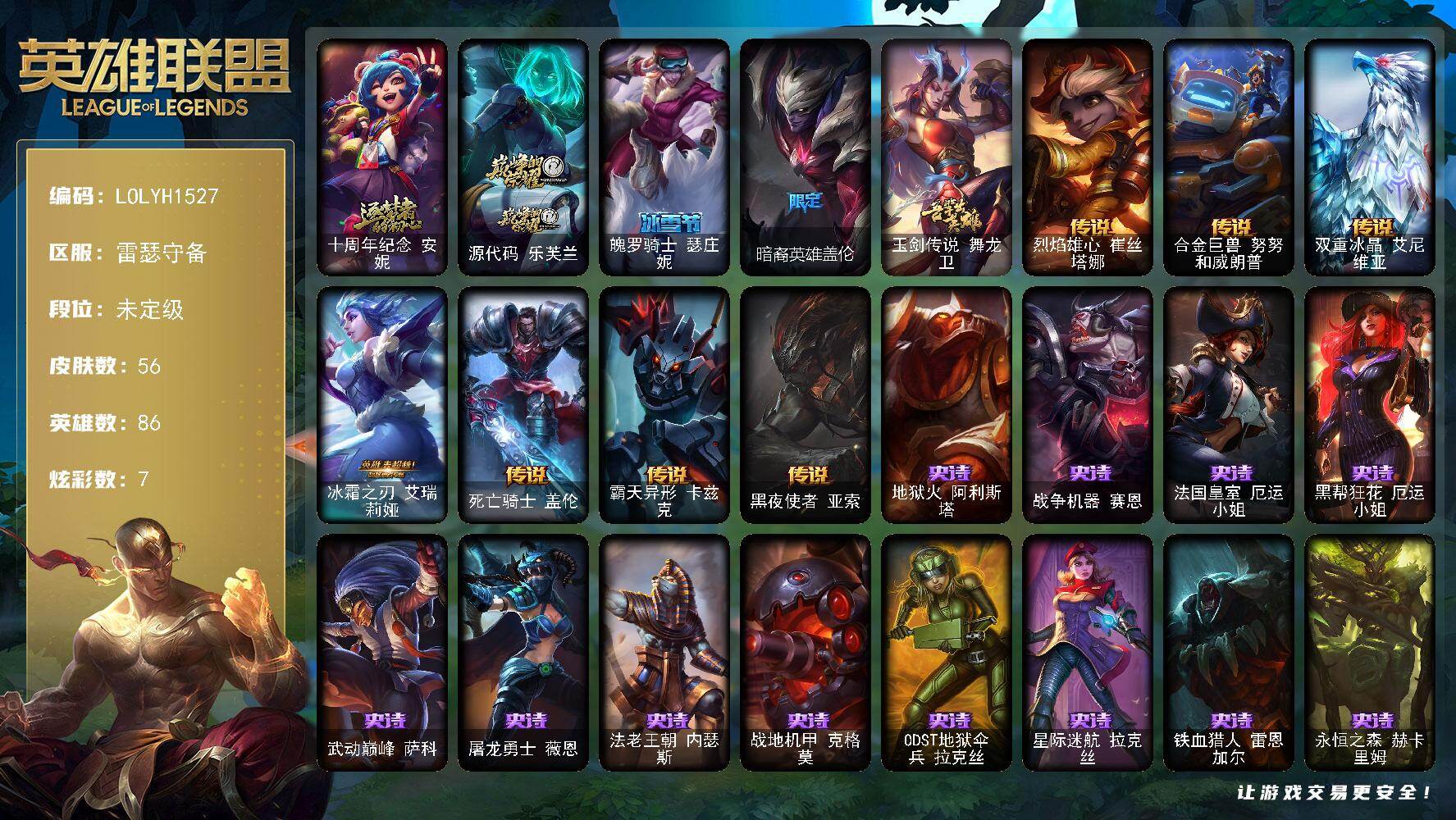 【497341】【LOLYH1527】86英雄/56皮肤/2神话/3限定/4臻彩/7炫彩/7传说/13史诗/未定级/十周年纪念安妮/源代码乐芙兰/春晖神女/无畏骑士瑟庄妮赤子初心/玉剑传说翼剑仙珠光/星之守护者霞烈羽/破败军团厄运小姐灵岛征伐使/魄罗骑士瑟庄妮/暗裔英雄盖伦/玉剑传说舞龙卫/烈焰雄心崔丝塔娜/合金巨兽努努和威朗普/双重冰晶艾尼维亚/冰霜之刃艾瑞莉娅/死亡骑士盖伦/霸天异形卡兹克/