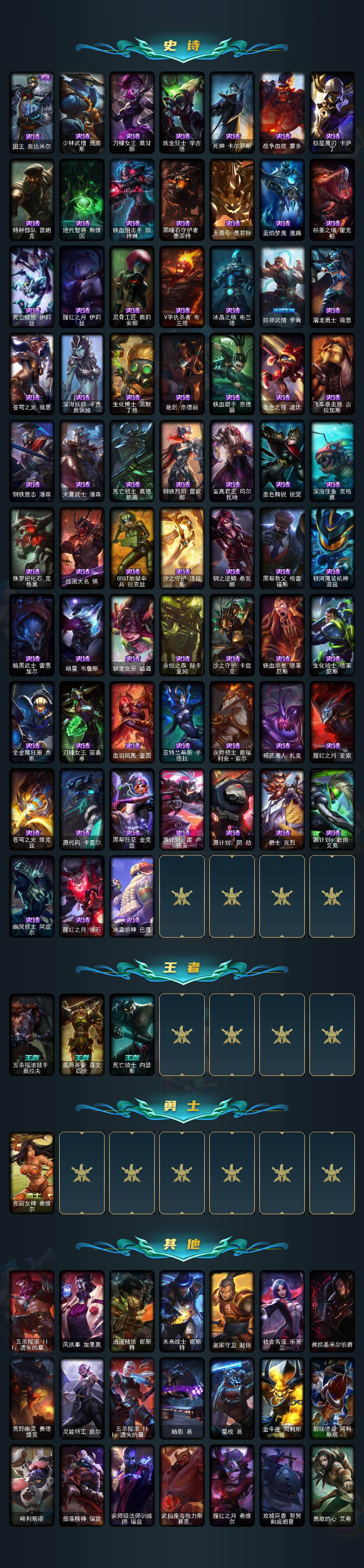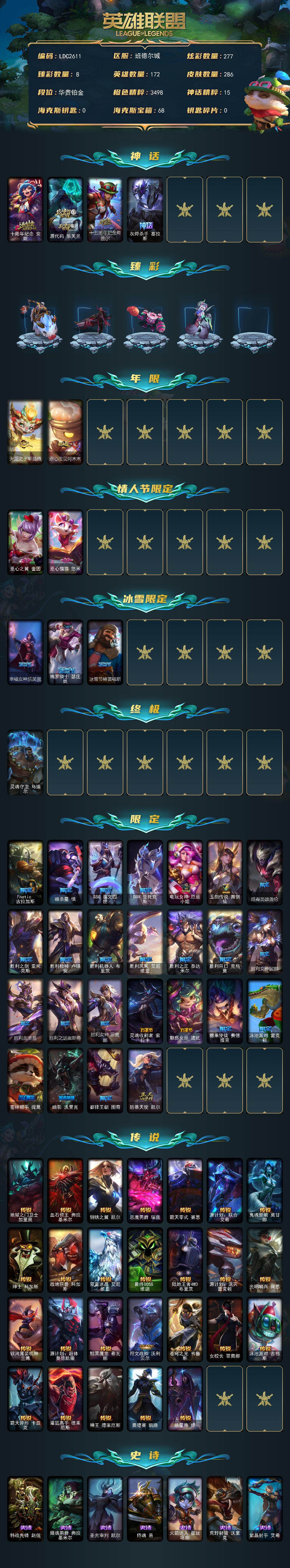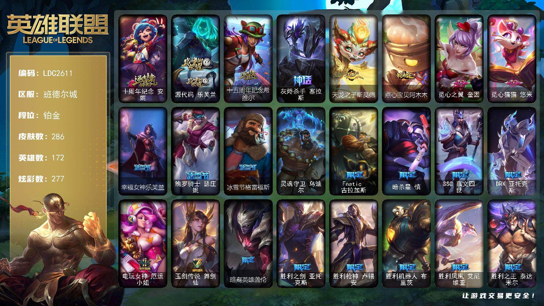 【497390】【LDC2611】172英雄/286皮肤/1终极/4神话/33限定/8臻彩/277炫彩/26传说/73史诗/铂金/十周年纪念安妮/源代码乐芙兰/十五周年纪念希维尔/灰烬杀手塞拉斯/无畏骑士瑟庄妮赤子初心/星之守护者娑娜未来之光/西部天使赛娜贝利尔之怠/幻灵战斗蝠薇恩梦幻强袭/可爱可爱粉红红布里茨/魔女阿卡丽虚荣/净雪之月莫甘娜冬虹/墨之影武者永恩灵墨刻影/天龙之子斯莫德/点心宝贝