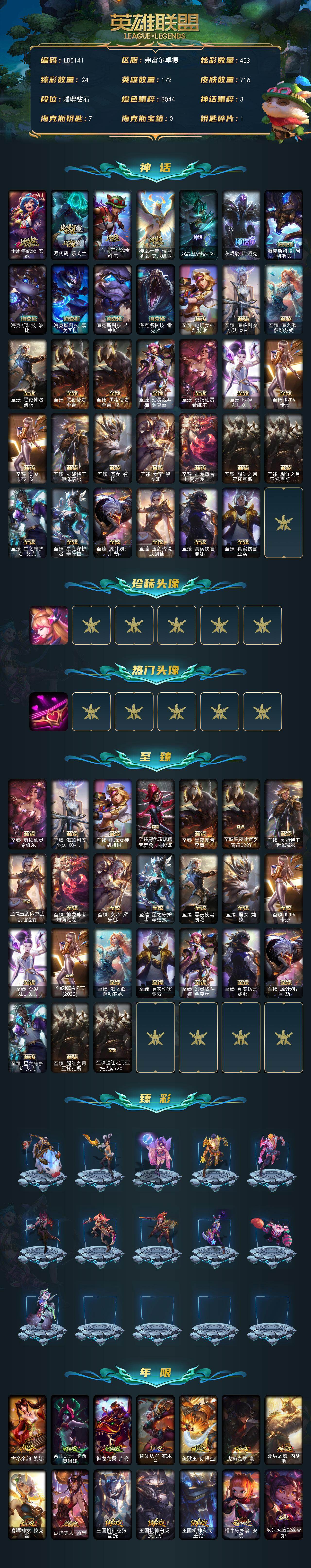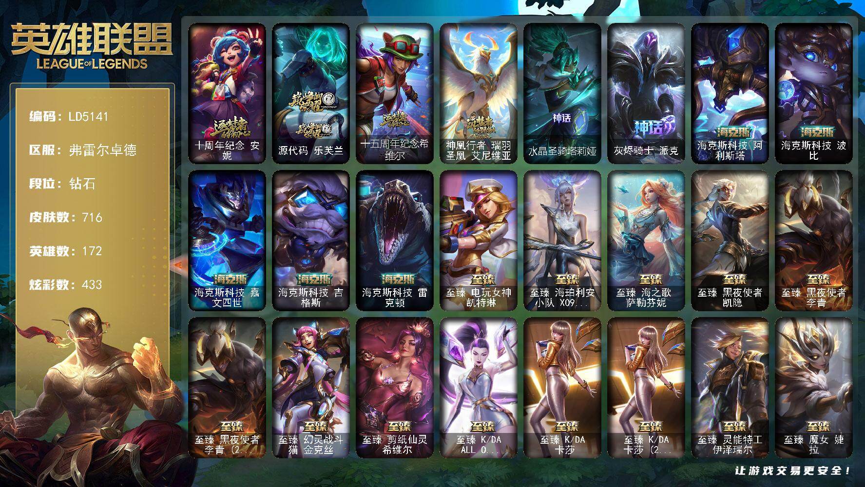 【498299】【LD5141】172英雄/716皮肤/2终极/35神话/118限定/24臻彩/433炫彩/83传说/130史诗/钻石/十周年纪念安妮/源代码乐芙兰/十五周年纪念希维尔/神凰行者瑞羽凤凰艾尼维亚/水晶圣骑塔莉娅/灰烬骑士派克/海克斯科技阿利斯塔/海克斯科技波比/海克斯科技嘉文四世/海克斯科技吉格斯/海克斯科技雷克顿/至臻真实伤害赛娜/至臻真实伤害亚索/至臻电玩女神凯特琳/至臻海珀