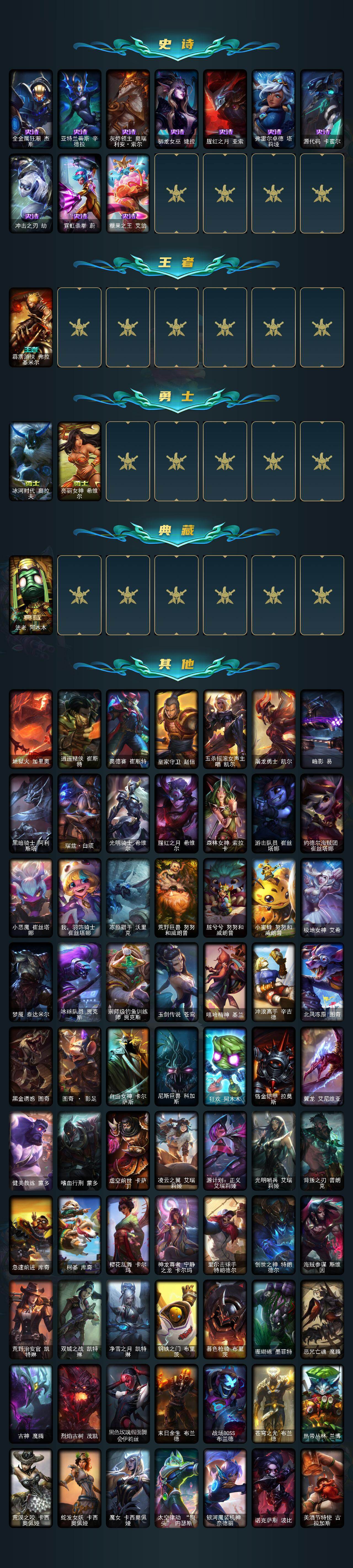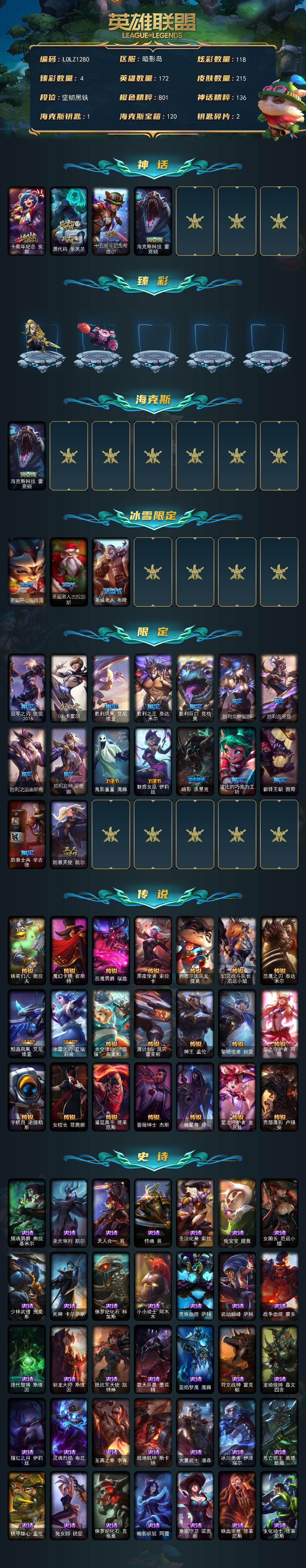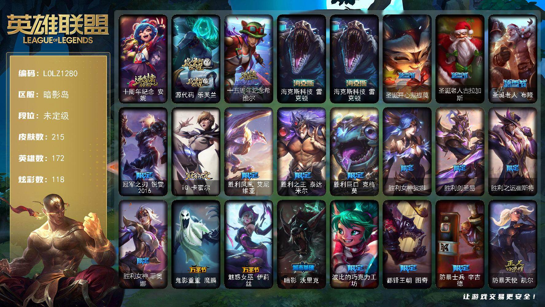 【501192】【LOLZ1280】172英雄/215皮肤/4神话/20限定/4臻彩/118炫彩/21传说/45史诗/未定级/十周年纪念安妮/源代码乐芙兰/十五周年纪念希维尔/海克斯科技雷克顿/赵云子龙炫金将军/灵魂莲华亚索霜见之时/可爱可爱粉红红布里茨/魔女阿卡丽虚荣/圣诞开心鬼提莫/圣诞老人古拉加斯/圣诞老人布隆/冠军之刃锐雯2018/IG卡密尔/胜利凤凰艾尼维亚/胜利之王泰达米尔/胜利巨口