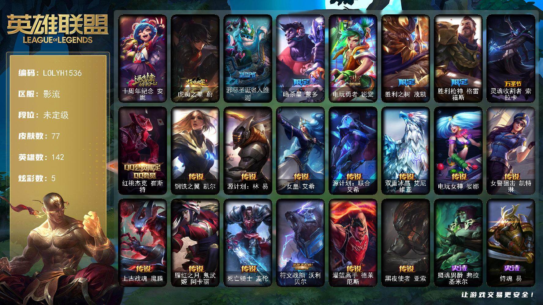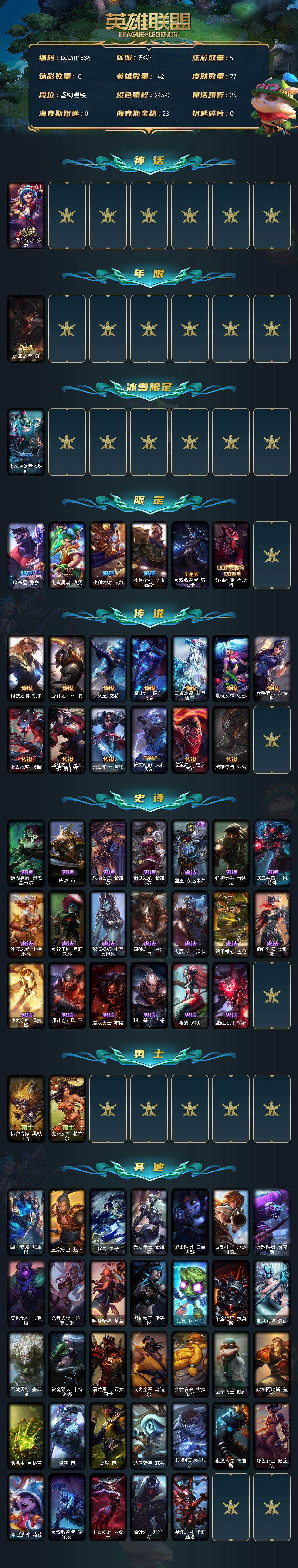 【503228】【LOLYH1536】142英雄/77皮肤/1神话/8限定/5炫彩/13传说/20史诗/未定级/十周年纪念安妮/虎痴之拳蔚/邪恶圣诞老人维迦/暗杀星蒙多/电玩勇者锐雯/胜利之树茂凯/胜利枪神格雷福斯/灵魂收割者索拉卡/红桃杰克崔斯特/钢铁之翼凯尔/源计划:林易/女皇艾希/源计划:联合艾希/双重冰晶艾尼维亚/电玩女神娑娜/女警狙击凯特琳/上古战魂魔腾/腥红之月鬼舞姬阿卡丽/死亡骑士