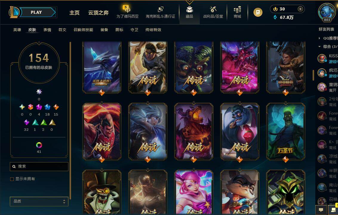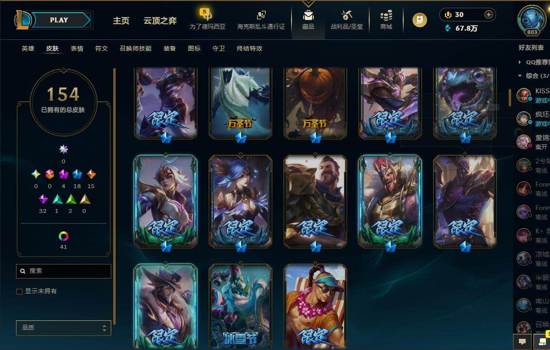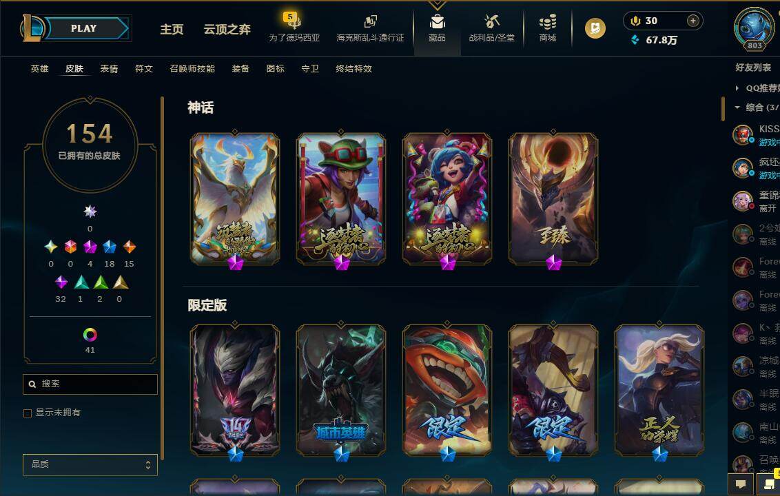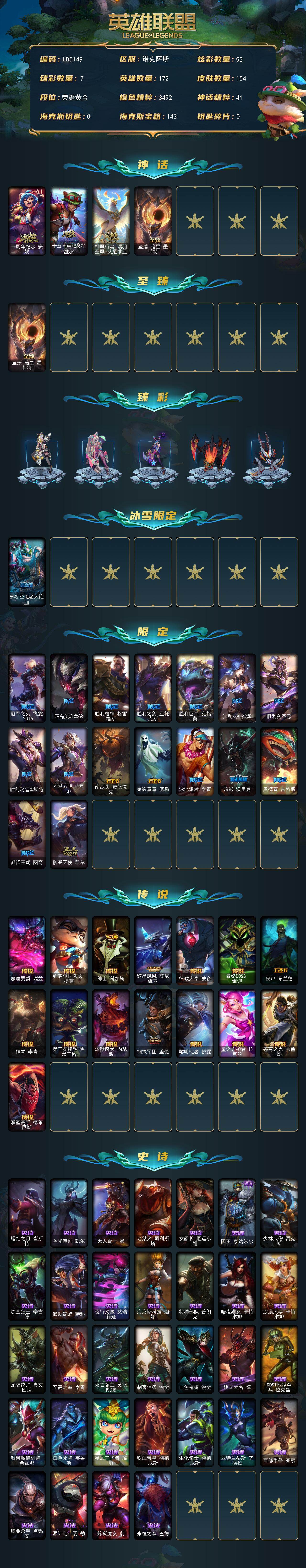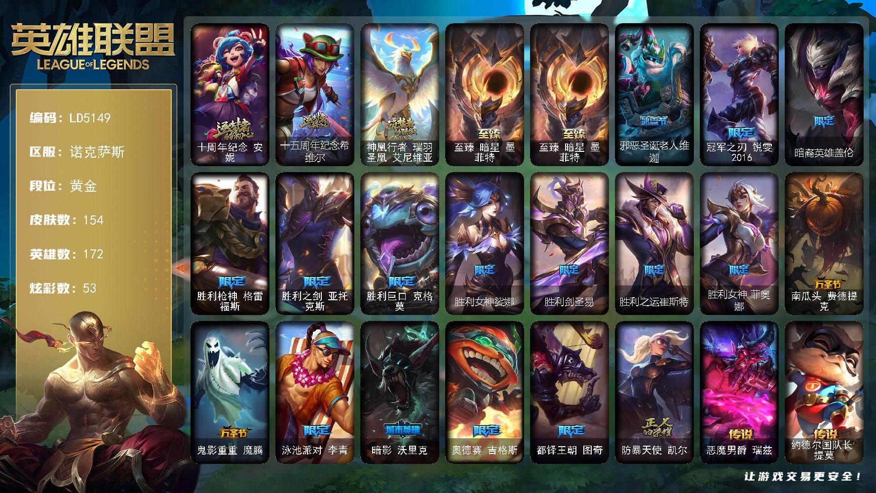 【503285】【LD5149】172英雄/154皮肤/4神话/18限定/7臻彩/53炫彩/15传说/32史诗/黄金账号等级:803/十周年纪念安妮/十五周年纪念希维尔/神凰行者瑞羽凤凰艾尼维亚/至臻暗星墨菲特/咖啡甜心金克丝核桃巴菲/幻灵战斗猫金克丝梦幻强袭/星之守护者金克丝黑洞/山海绘卷科加斯朱红/霸天异形卡兹克刹那银光/星之守护者阿卡丽热情之光/魔女阿卡丽虚荣/邪恶圣诞老人维迦/冠军之刃锐