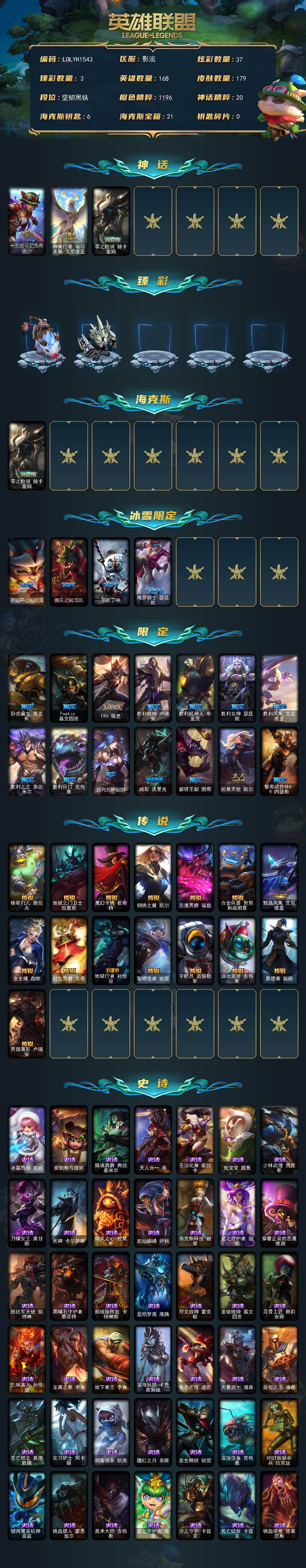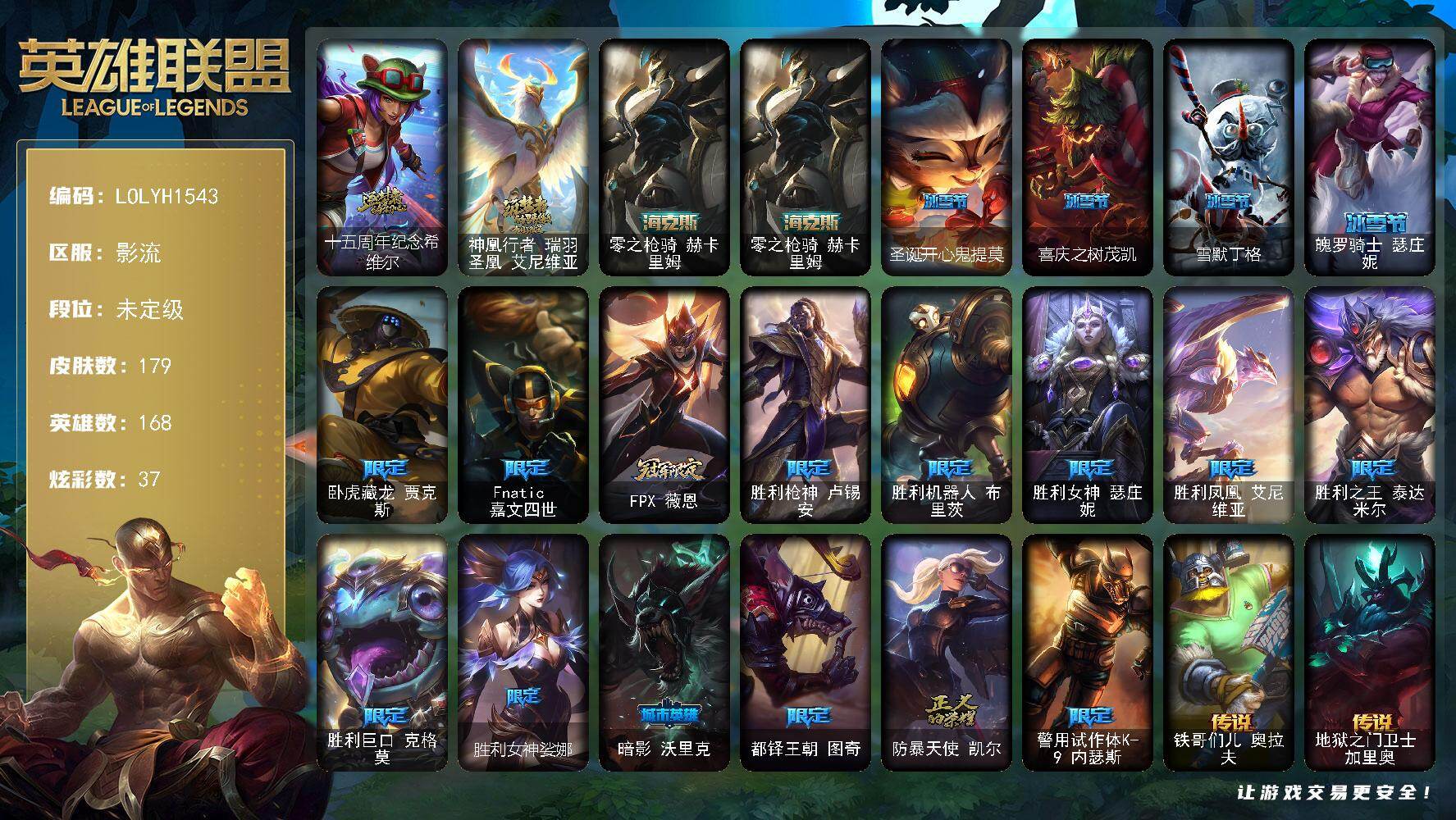 【503511】【LOLYH1543】168英雄/179皮肤/3神话/18限定/3臻彩/37炫彩/15传说/54史诗/未定级账号等级:426/十五周年纪念希维尔/神凰行者瑞羽凤凰艾尼维亚/零之枪骑赫卡里姆/无畏骑士瑟庄妮赤子初心/霸天巨兽雪崩墨菲特/魔女阿卡丽虚荣/圣诞开心鬼提莫/喜庆之树茂凯/雪默丁格/魄罗骑士瑟庄妮/卧虎藏龙贾克斯/Fnatic嘉文四世/FPX薇恩/胜利枪神卢锡安/胜利机器人
