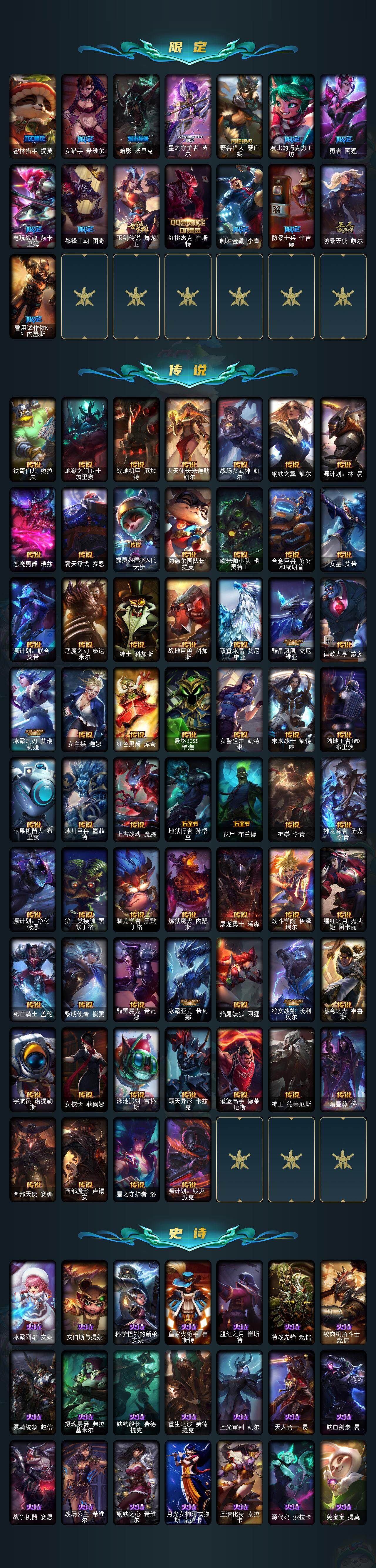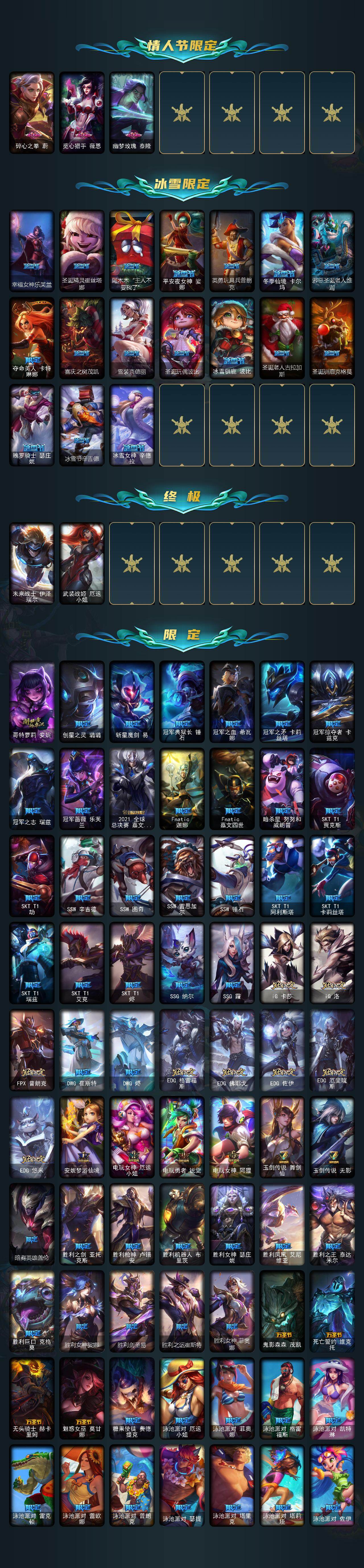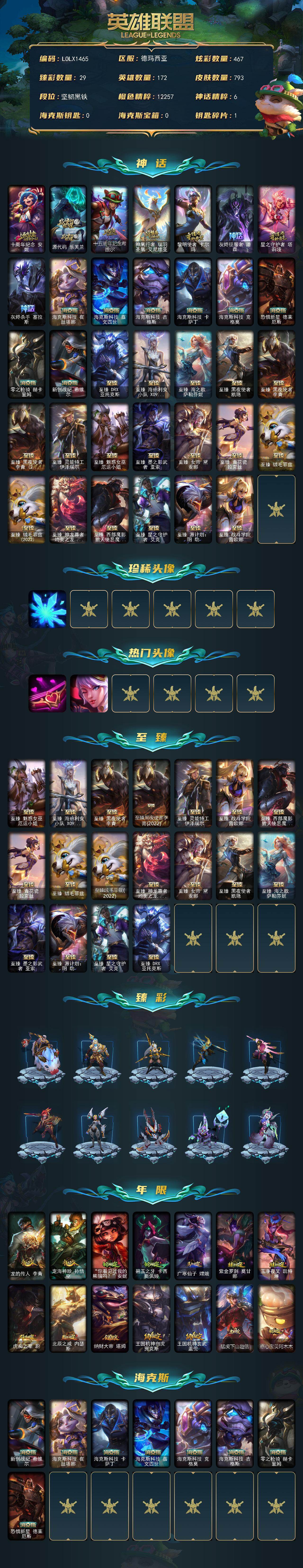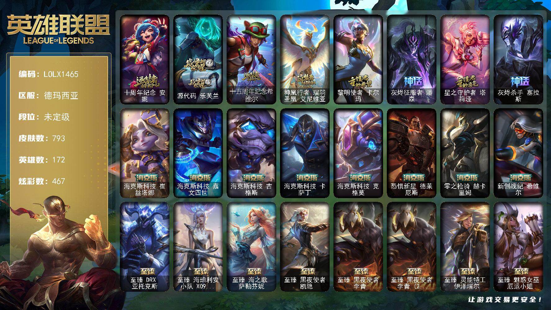 【503788】【LOLX1465】172英雄/793皮肤/2终极/34神话/120限定/29臻彩/467炫彩/60传说/183史诗/未定级/十周年纪念安妮/源代码乐芙兰/十五周年纪念希维尔/神凰行者瑞羽凤凰艾尼维亚/黎明使者卡尔玛/灰烬征服者潘森/星之守护者塔莉垭/灰烬杀手塞拉斯/海克斯科技崔丝塔娜/海克斯科技嘉文四世/海克斯科技吉格斯/海克斯科技卡萨丁/海克斯科技克格莫/恐惧新星德莱厄斯/零