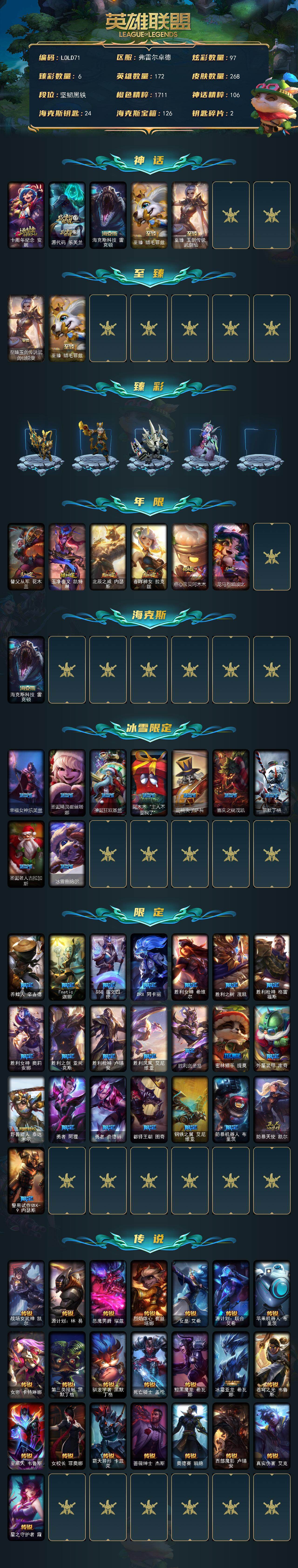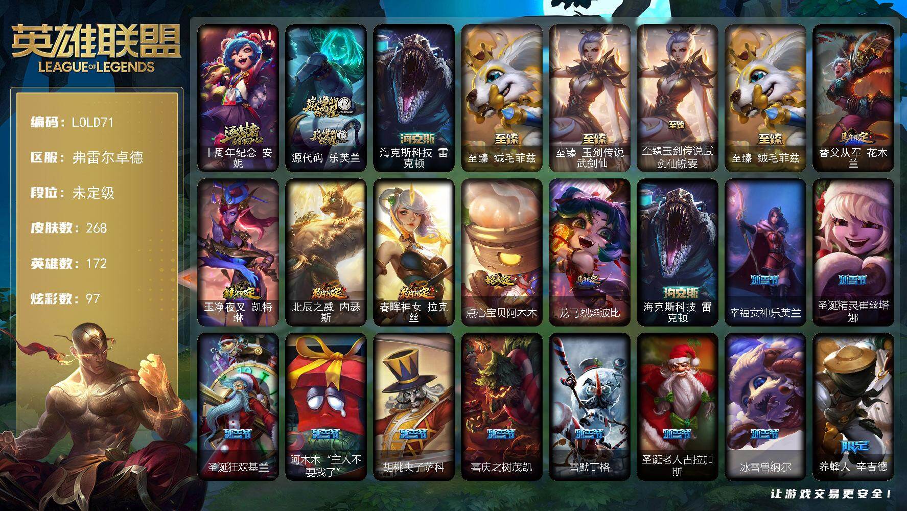 【504926】【LOLD71】172英雄/268皮肤/5神话/37限定/6臻彩/97炫彩/22传说/67史诗/未定级/十周年纪念安妮/源代码乐芙兰/海克斯科技雷克顿/至臻绒毛菲兹/至臻玉剑传说武剑仙/吕布奉先炫金战神/替父从军花木兰炫金龙刃/霸天巨兽雪崩墨菲特/春晖神女艾希玉露金风/魔女阿卡丽虚荣/净雪之月莫甘娜冬虹/替父从军花木兰/玉净夜叉凯特琳/北辰之威内瑟斯/春晖神女拉克丝/点心宝贝阿木