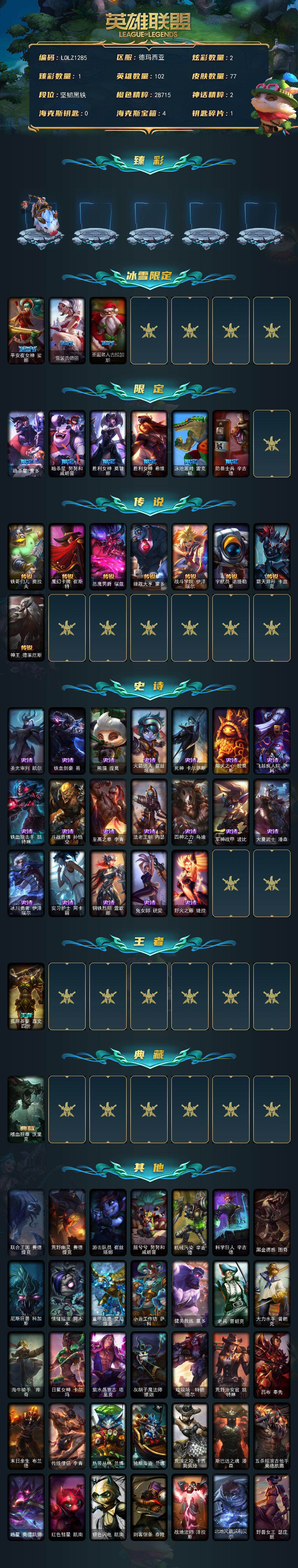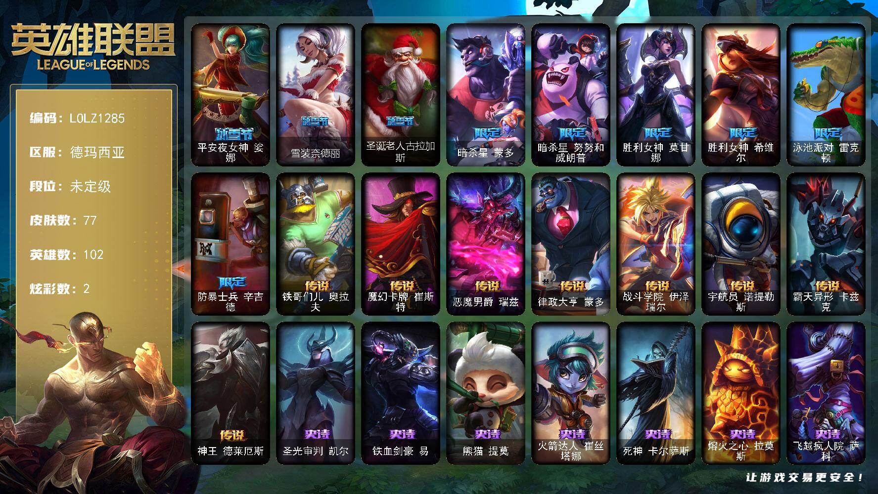 【505206】【LOLZ1285】102英雄/77皮肤/9限定/1臻彩/2炫彩/8传说/19史诗/未定级/无畏骑士瑟庄妮赤子初心/平安夜女神娑娜/雪装奈德丽/圣诞老人古拉加斯/暗杀星蒙多/暗杀星努努和威朗普/胜利女神莫甘娜/胜利女神希维尔/泳池派对雷克顿/防暴士兵辛吉德/铁哥们儿奥拉夫/魔幻卡牌崔斯特/恶魔男爵瑞兹/律政大亨蒙多/战斗学院伊泽瑞尔/宇航员诺提勒斯/霸天异形卡兹克/神王德莱厄斯/