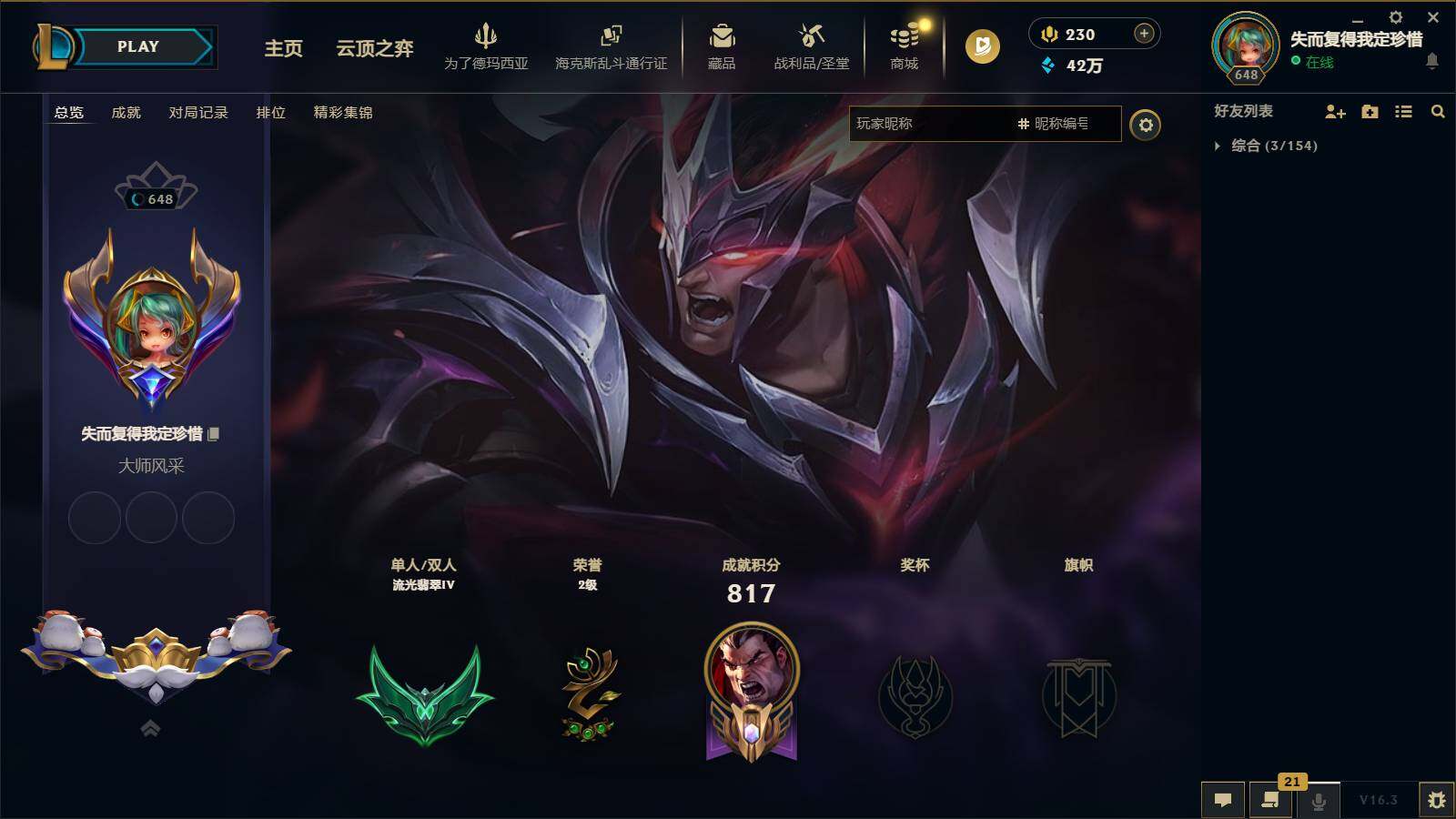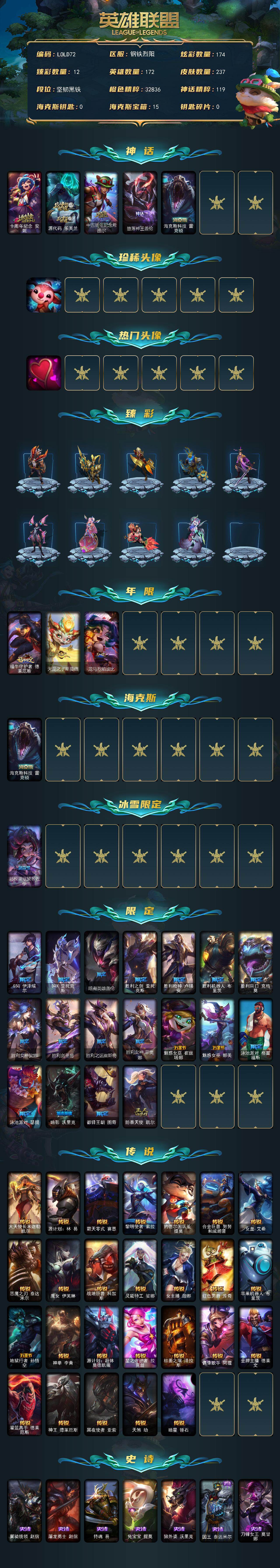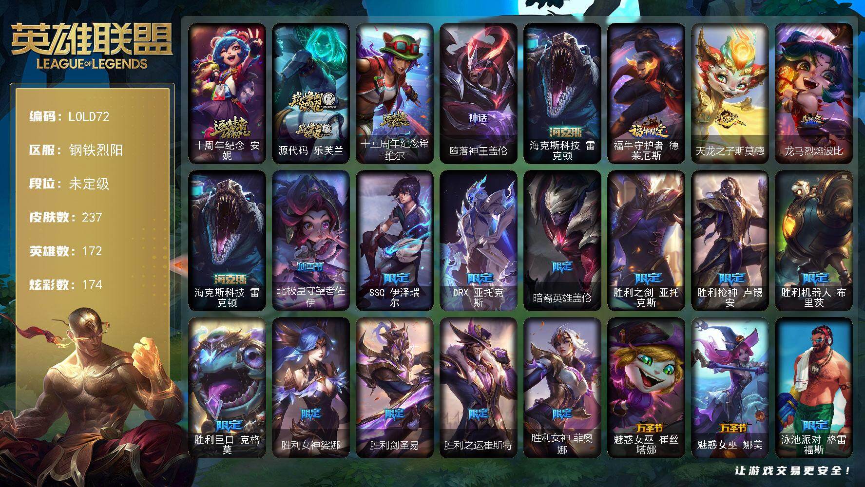 【505614】【LOLD72】172英雄/237皮肤/5神话/24限定/12臻彩/174炫彩/26传说/48史诗/未定级账号等级:648/十周年纪念安妮/源代码乐芙兰/十五周年纪念希维尔/堕落神王盖伦/海克斯科技雷克顿/至爱的鹿/爱意绵绵/巅峰之拳瑟提明镜止水/吕布奉先炫金战神/征服者韦鲁斯炫金/冠军典狱长锤石凯旋圣装/玉剑传说无极麒麟/弹幕天使卡莎炽天使勇敢/星之守护者萨勒芬妮未来之光/玉剑