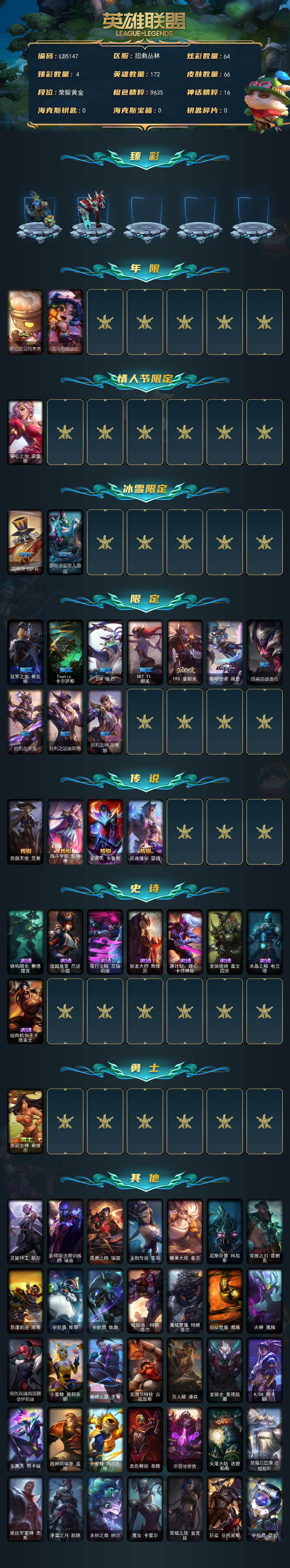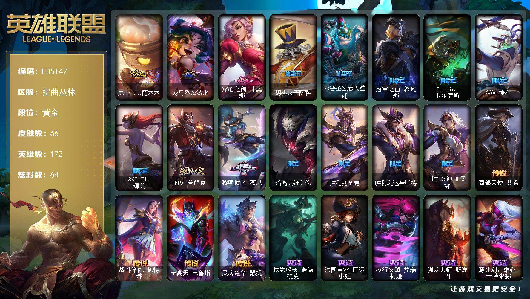 【505635】【LD5147】172英雄/66皮肤/17限定/4臻彩/64炫彩/4传说/8史诗/黄金/冠军典狱长锤石凯旋圣装/霸天战士雷恩加尔星啸天火/星之守护者阿卡丽热情之光/霸天异形卡兹克黄金异端/点心宝贝阿木木/龙马烈焰波比/穿心之剑菲奥娜/胡桃夹子萨科/邪恶圣诞老人维迦/冠军之血希瓦娜/Fnatic卡尔萨斯/SSW锤石/SKTT1娜美/FPX普朗克/黎明使者薇恩/暗裔英雄盖伦/胜利剑圣