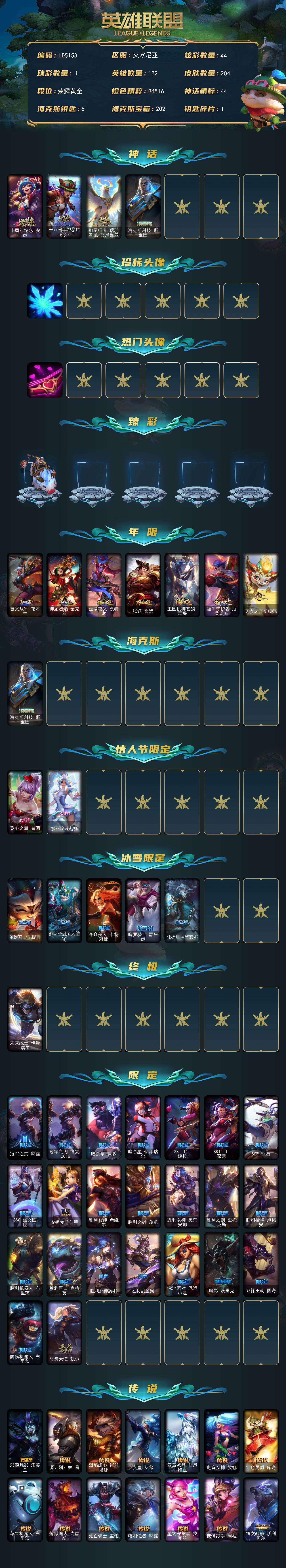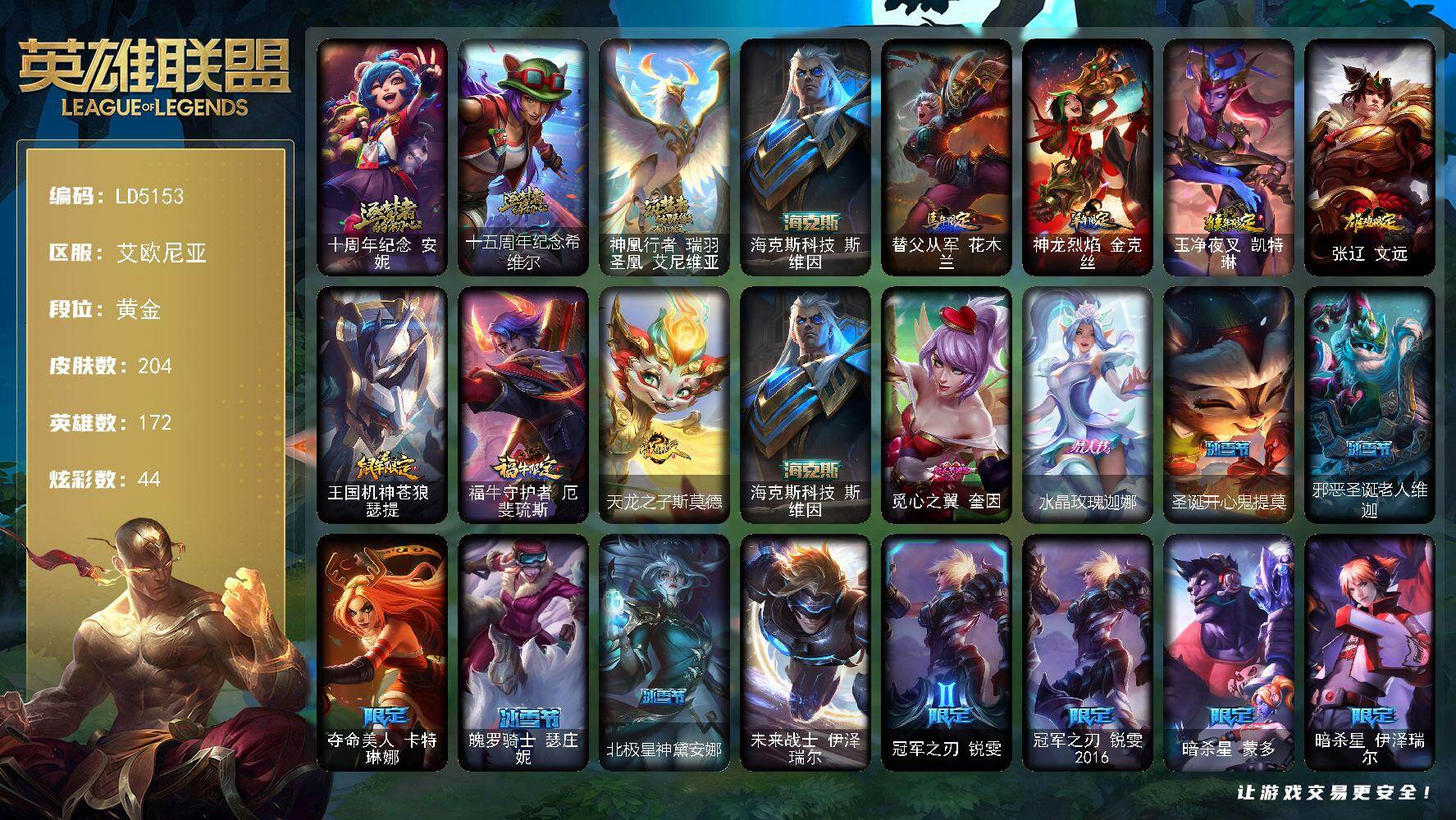 【506942】【LD5153】172英雄/204皮肤/1终极/4神话/37限定/1臻彩/44炫彩/17传说/45史诗/黄金/十周年纪念安妮/十五周年纪念希维尔/神凰行者瑞羽凤凰艾尼维亚/海克斯科技斯维因/雪花/爱情之歌/无畏骑士瑟庄妮赤子初心/替父从军花木兰/神龙烈焰金克丝/玉净夜叉凯特琳/张辽文远/王国机神苍狼瑟提/福牛守护者厄斐琉斯/天龙之子斯莫德/觅心之翼奎因/水晶玫瑰迦娜/圣诞开心鬼提