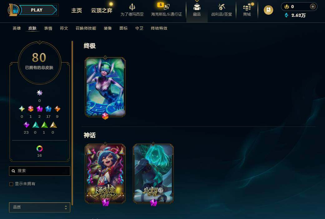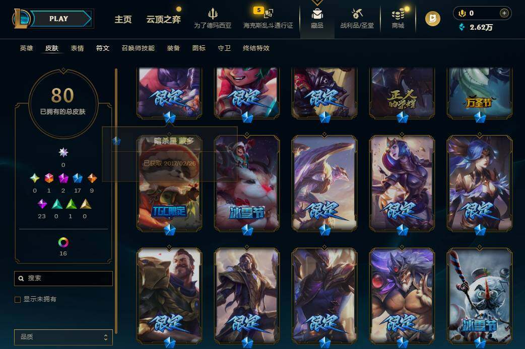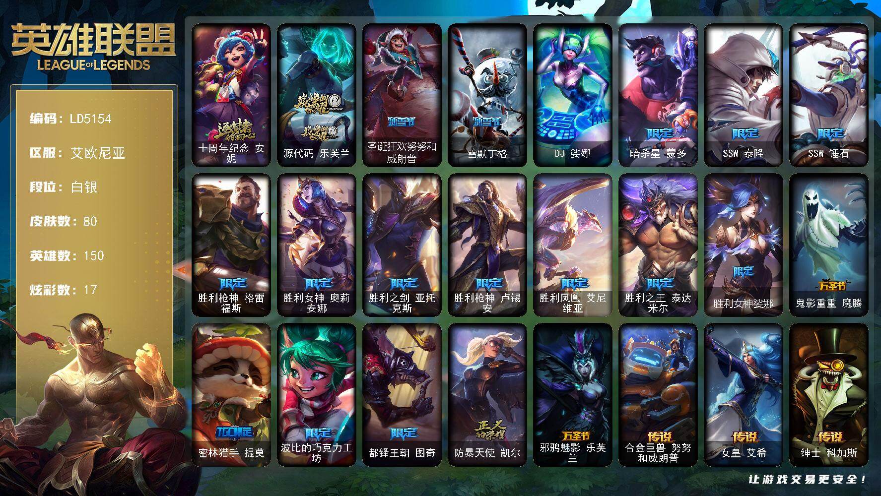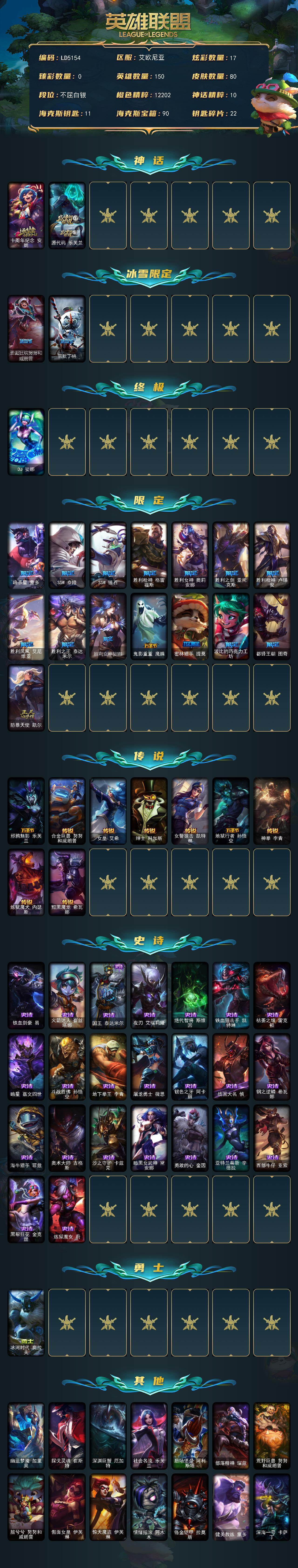 【506944】【LD5154】150英雄/80皮肤/1终极/2神话/17限定/17炫彩/9传说/23史诗/白银/十周年纪念安妮/源代码乐芙兰/圣诞狂欢努努和威朗普/雪默丁格/DJ娑娜/暗杀星蒙多/SSW泰隆/SSW锤石/胜利枪神格雷福斯/胜利女神奥莉安娜/胜利之剑亚托克斯/胜利枪神卢锡安/胜利凤凰艾尼维亚/胜利之王泰达米尔/胜利女神娑娜/鬼影重重魔腾/密林猎手提莫/波比的巧克力工坊/都铎王朝图