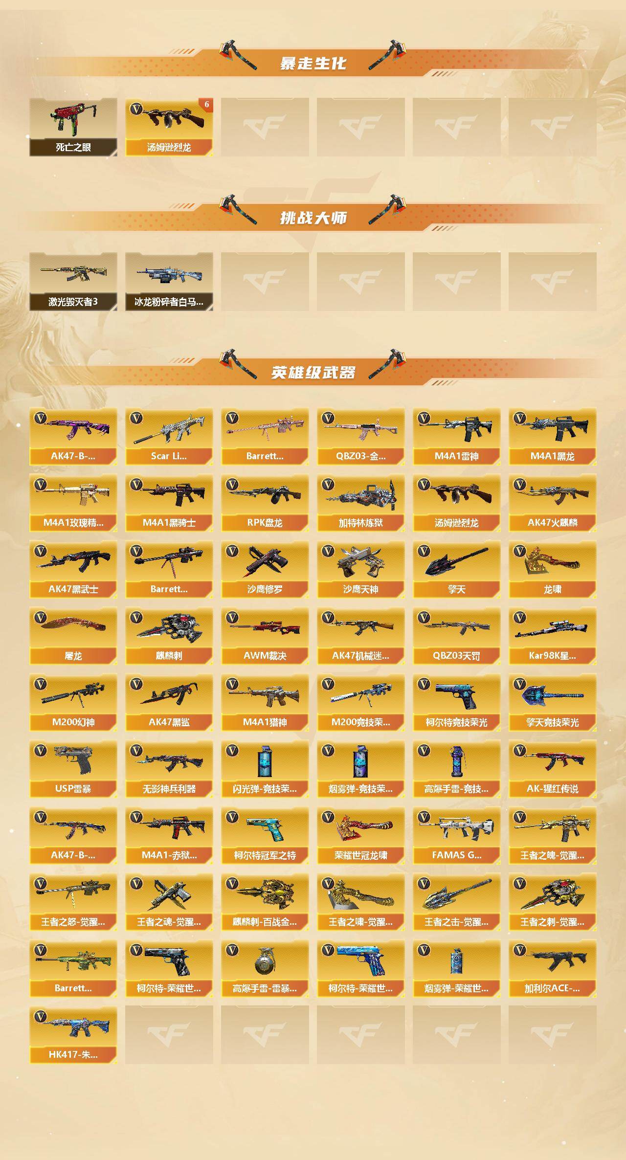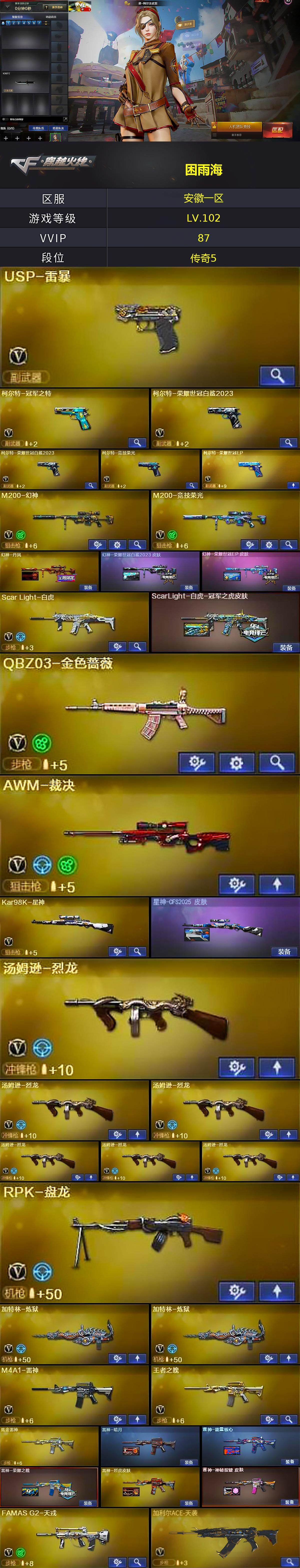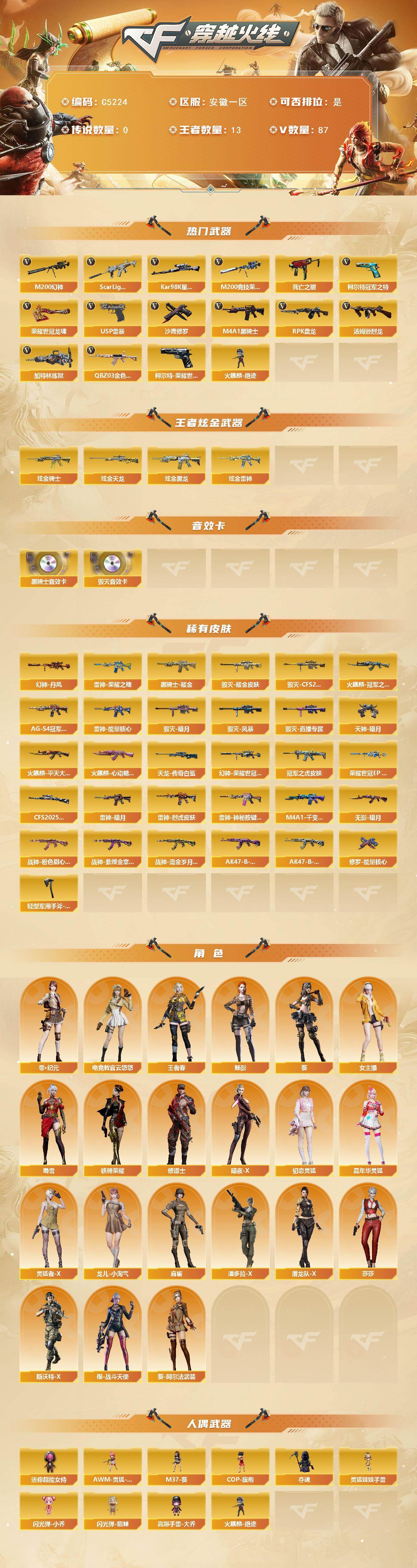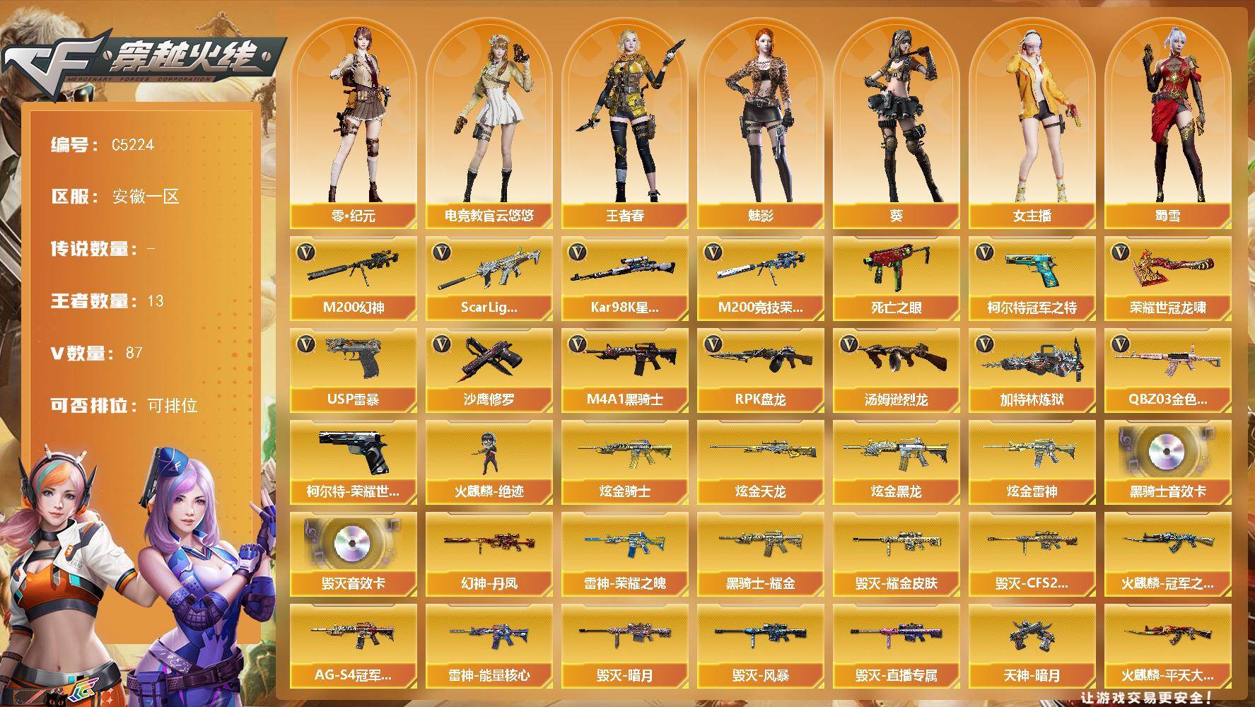 【506975】【506975】【C5224】安徽一区-94V-13王者武器数-4炫金武器数【热门武器】:QBZ03-金色蔷薇,Scar Light-白虎,M