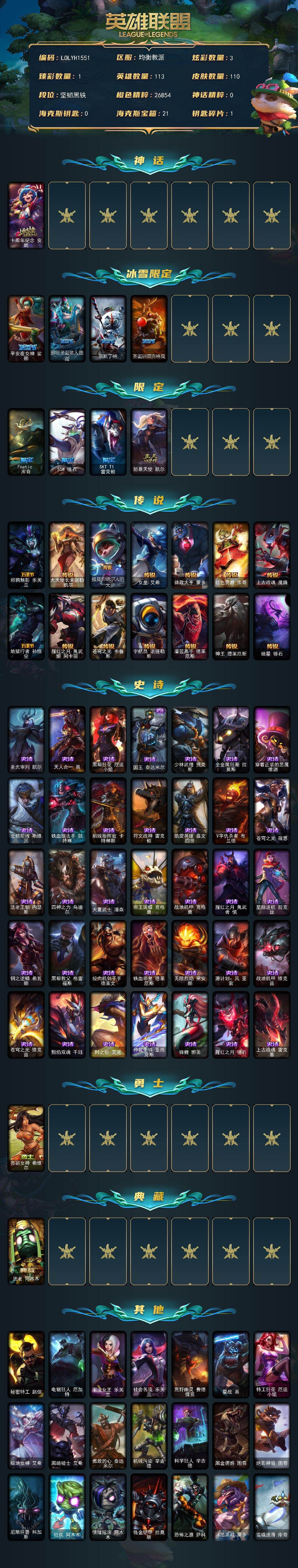 【507291】【LOLYH1551】113英雄/110皮肤/1神话/8限定/1臻彩/3炫彩/14传说/35史诗/未定级/十周年纪念安妮/魔女阿卡丽虚荣/平安夜女神娑娜/邪恶圣诞老人维迦/雪默丁格/圣诞驯鹿克格莫/Fnatic库奇/SSW锤石/SKTT1雷克顿/防暴天使凯尔/邪鸦魅影乐芙兰/大天使长米迦勒凯尔/提莫“约德尔人的一大步”/女皇艾希/律政大亨蒙多/红色男爵库奇/上古战魂魔腾/地狱行者
