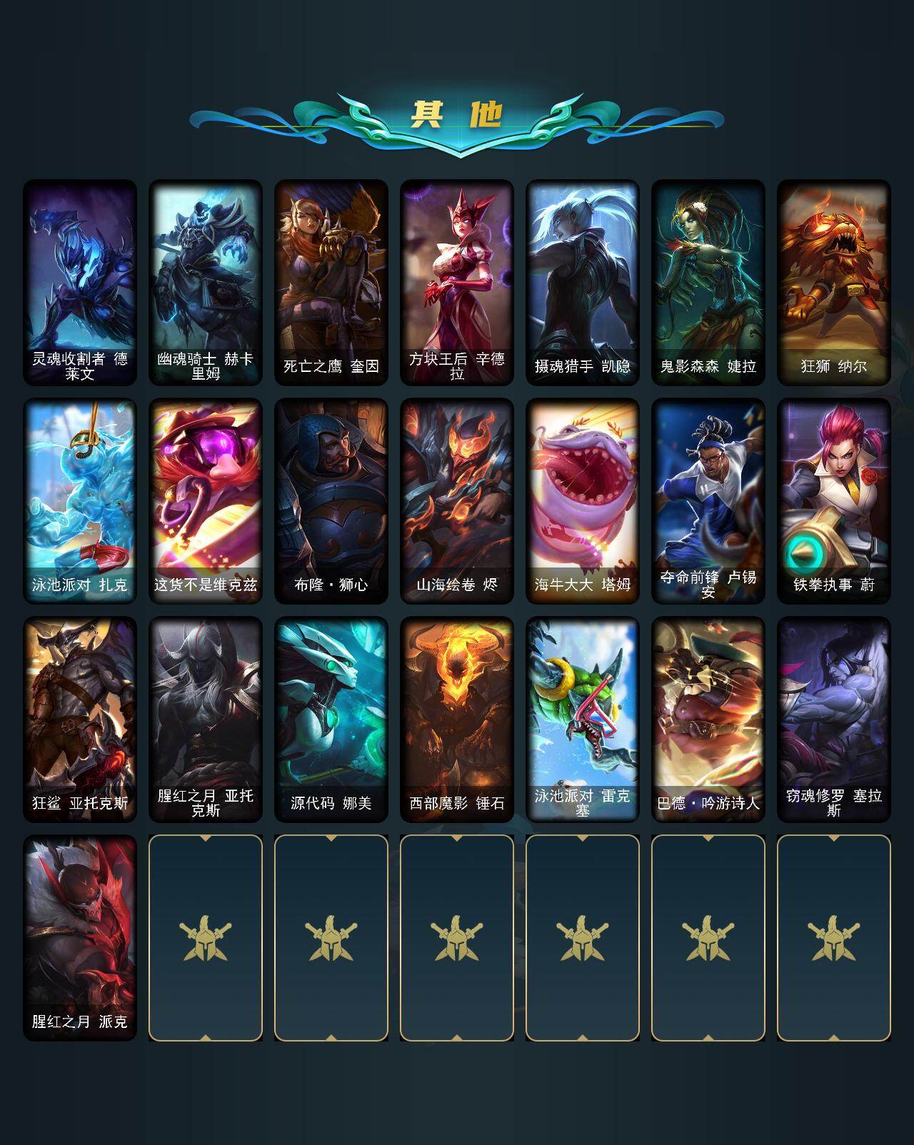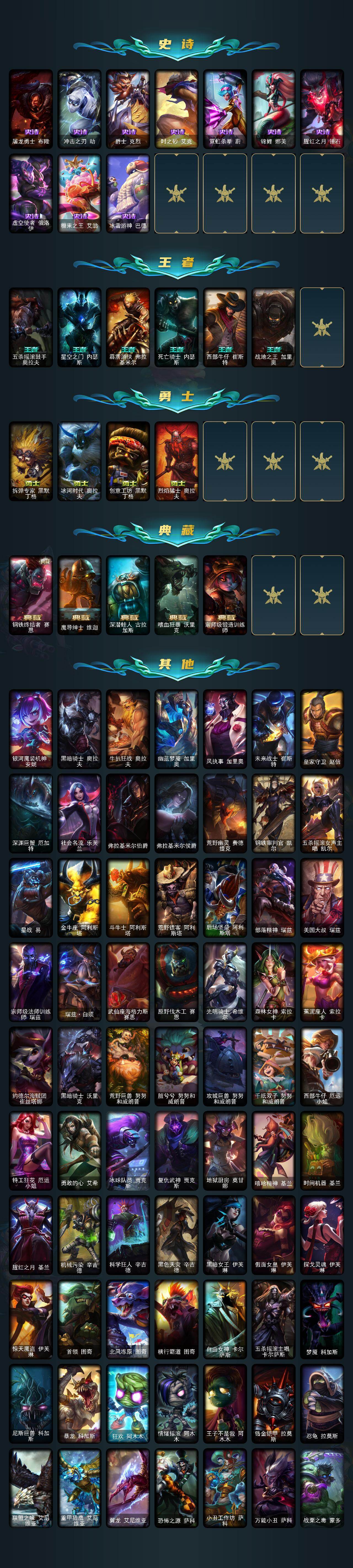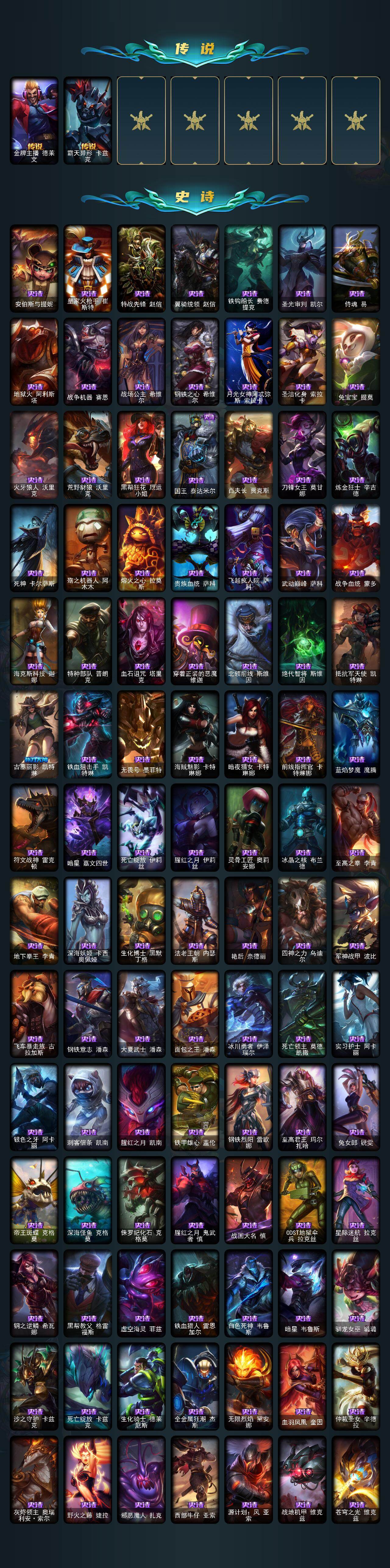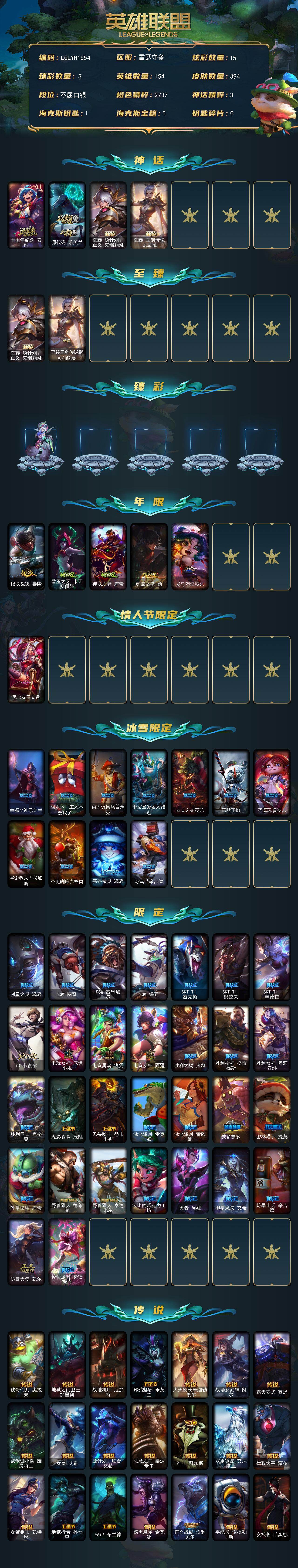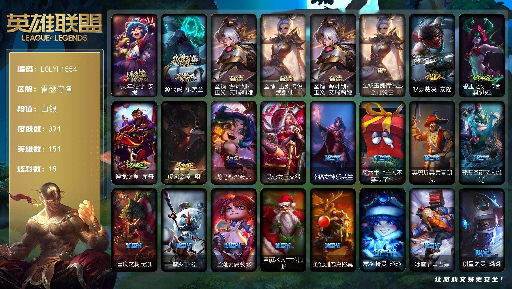 【507308】【LOLYH1554】154英雄/394皮肤/4神话/47限定/3臻彩/15炫彩/23传说/108史诗/白银/十周年纪念安妮/源代码乐芙兰/至臻源计划:正义艾瑞莉娅/至臻玉剑传说武剑仙/天龙之子卡莎飞龙乘云/魔女阿卡丽虚荣/净雪之月莫甘娜冬虹/银龙裁决泰隆/碧玉之牙卡西奥佩娅/神龙之翼库奇/虎痴之拳蔚/龙马烈焰波比/觅心女皇艾希/幸福女神乐芙兰/阿木木:“主人不要我了”/英勇玩具