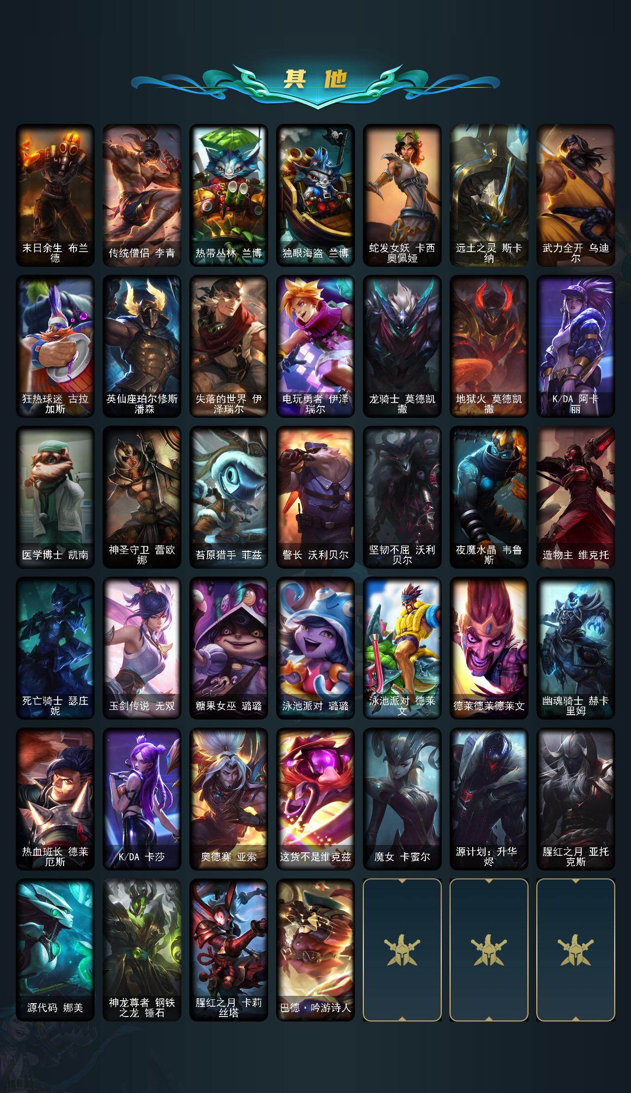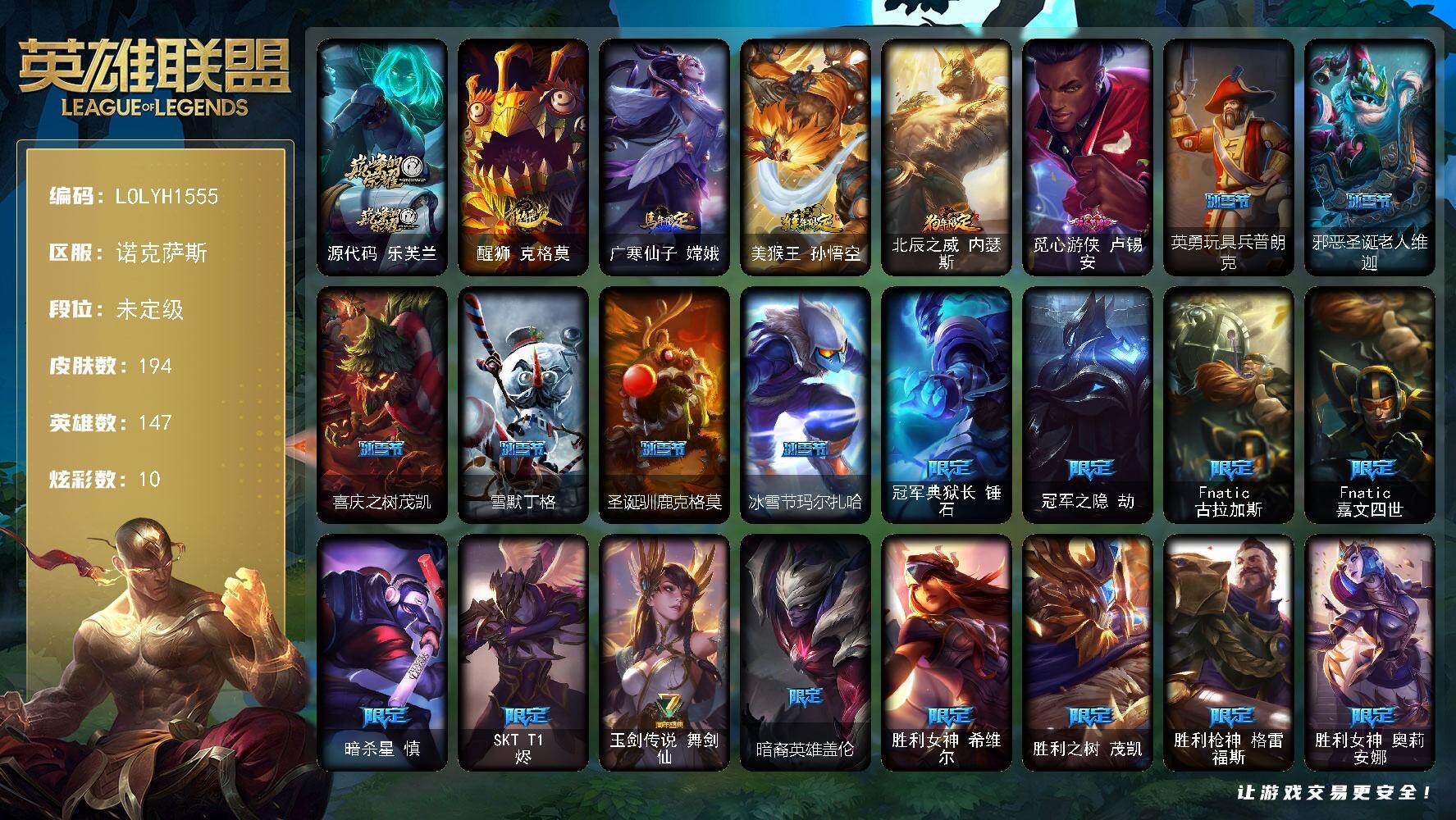 【507336】【LOLYH1555】147英雄/194皮肤/1神话/34限定/1臻彩/10炫彩/21传说/60史诗/未定级/源代码乐芙兰/红包/玉剑传说舞剑仙/玉剑传说苍鸾丁香/醒狮克格莫/广寒仙子嫦娥/美猴王孙悟空/北辰之威内瑟斯/觅心游侠卢锡安/英勇玩具兵普朗克/邪恶圣诞老人维迦/喜庆之树茂凯/雪默丁格/圣诞驯鹿克格莫/冰雪节玛尔扎哈/冠军典狱长锤石/冠军之隐劫/Fnatic古拉加斯/Fn