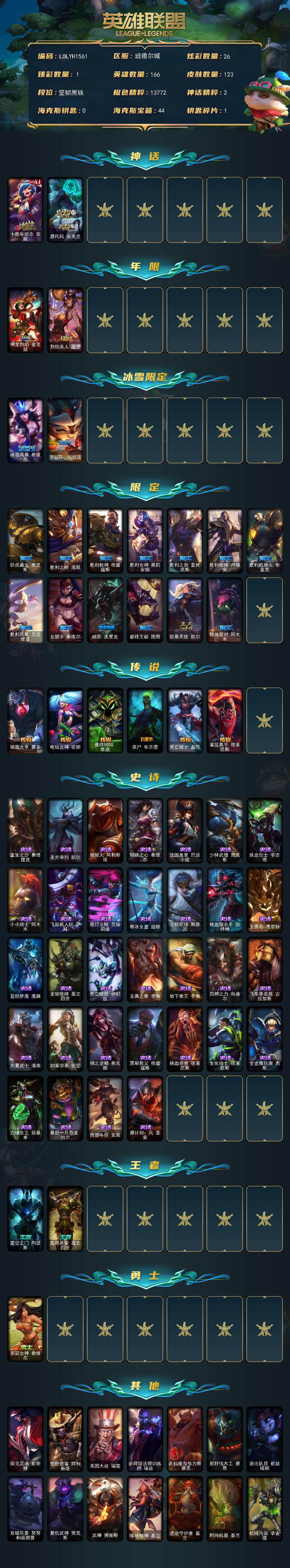 【507364】【LOLYH1561】166英雄/123皮肤/2神话/17限定/1臻彩/26炫彩/6传说/32史诗/未定级/十周年纪念安妮/源代码乐芙兰/魔女阿卡丽虚荣/神龙烈焰金克丝/烈焰美人薇恩/冰雪风暴希维尔/圣诞开心鬼提莫/卧虎藏龙贾克斯/胜利之树茂凯/胜利枪神格雷福斯/胜利女神奥莉安娜/胜利之剑亚托克斯/胜利枪神卢锡安/胜利机器人布里茨/胜利凤凰艾尼维亚/女猎手希维尔/暗影妖狐阿狸/都