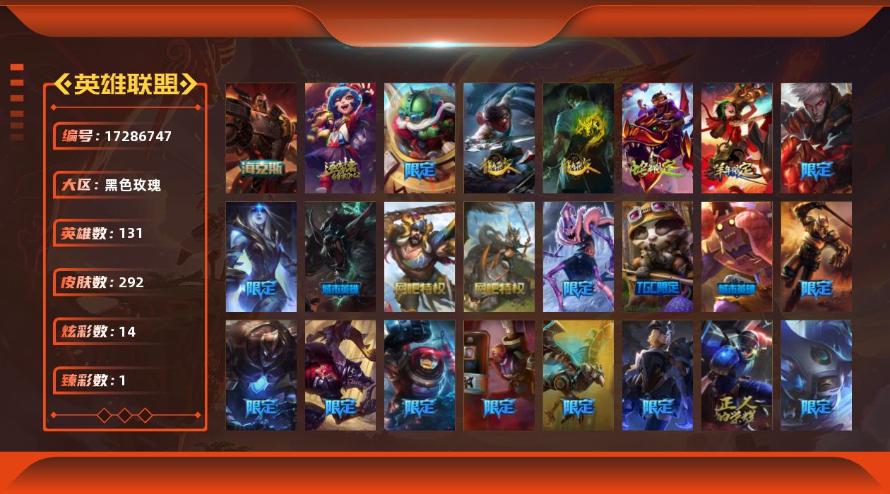 【507481】[17286747]【特价出售/店主推荐】未定级段位-131英雄-292皮肤-14炫彩-0终极-2神话-43限定-30传说-88史诗【神话皮肤】:十周年纪念安妮,恐惧新星德莱厄斯【臻彩皮肤】:偶像歌手阿狸极地雪莲【年限皮肤】:龙的传人李青,银龙裁决泰隆,神龙之翼库奇,神龙烈焰金克丝【海克斯皮肤】:恐惧新星德莱厄斯【冰雪限定】:圣诞精灵崔丝塔娜,圣诞狂欢基兰,阿木木“主人不要我了”