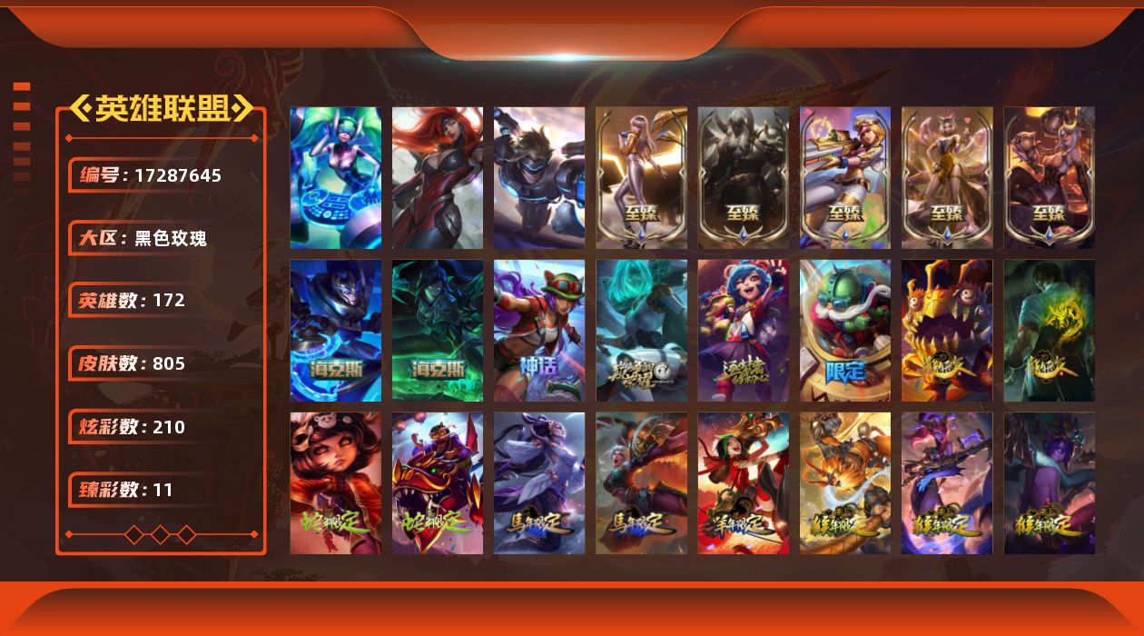 【507527】[17287645]【店主推荐捡漏号】未定级段位-172英雄-805皮肤-210炫彩-3终极-10神话-162限定-73传说-204史诗【神话皮肤】:十周年纪念安妮,源代码乐芙兰,十五周年纪念希维尔,海克斯科技嘉文四世,摄魂使者薇恩,至臻电玩女神凯特琳,至臻KDA阿狸,至臻KDA卡莎,至臻烈焰美人薇恩,至臻腥红之月亚托克斯【珍稀头像】:雪花头像,至爱的鹿头像【热门头像】:爱意绵绵