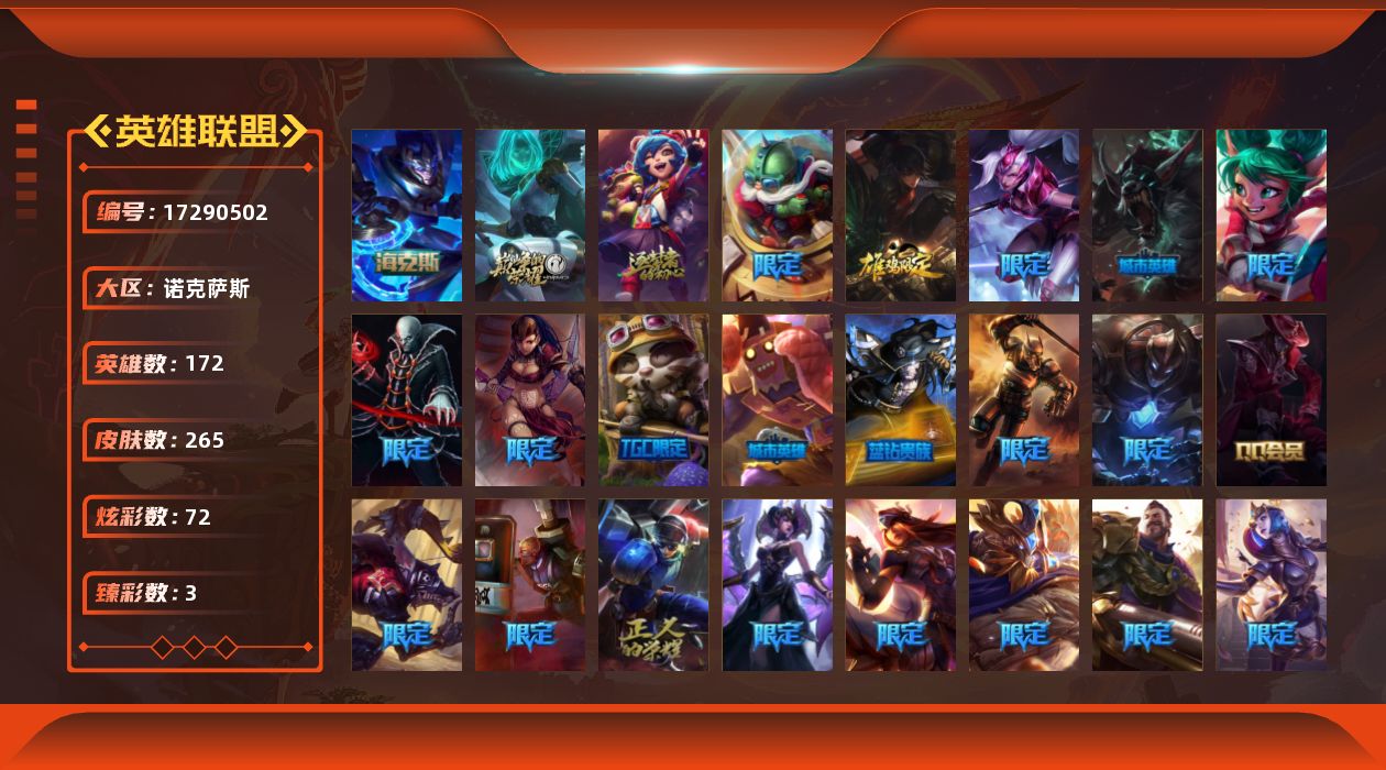 【507702】[17290502]铂金段位-172英雄-265皮肤-72炫彩-0终极-4神话-44限定-19传说-65史诗【神话皮肤】:十周年纪念安妮,源代码乐芙兰,神凰行者瑞羽圣凰艾尼维亚,海克斯科技嘉文四世【热门头像】:觅心之翼奎因头像【臻彩皮肤】:斗魂觉醒拉克丝无限斗志,幻灵战斗兔锐雯梦幻强袭,红莲之刃锐雯【年限皮肤】:虎痴之拳蔚【海克斯皮肤】:海克斯科技嘉文四世【冰雪限定】:幸福女神乐