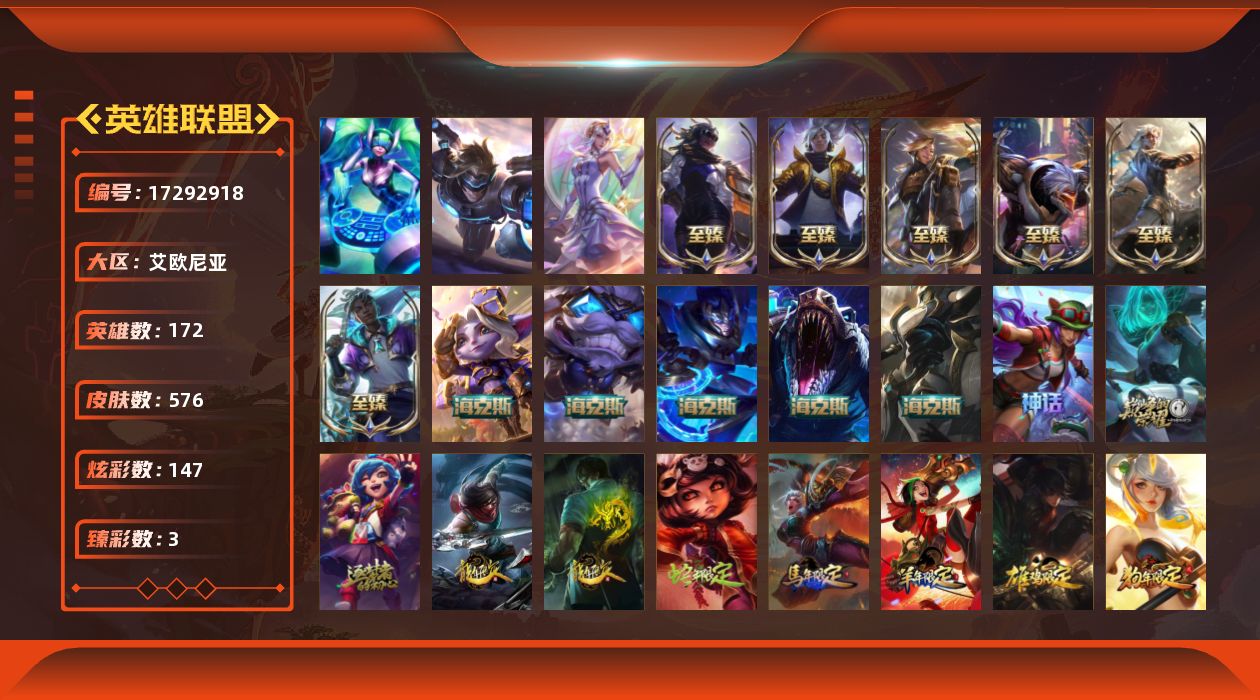 【507859】[17292918]青铜段位-172英雄-576皮肤-147炫彩-3终极-15神话-100限定-61传说-144史诗【神话皮肤】:十周年纪念安妮,源代码乐芙兰,十五周年纪念希维尔,神凰行者瑞羽圣凰艾尼维亚,海克斯科技崔丝塔娜,海克斯科技嘉文四世,海克斯科技吉格斯,海克斯科技雷克顿,零之枪骑赫卡里姆,至臻真实伤害赛娜,至臻真实伤害亚索,至臻黑夜使者凯隐,至臻灵能特工伊泽瑞尔,至臻星