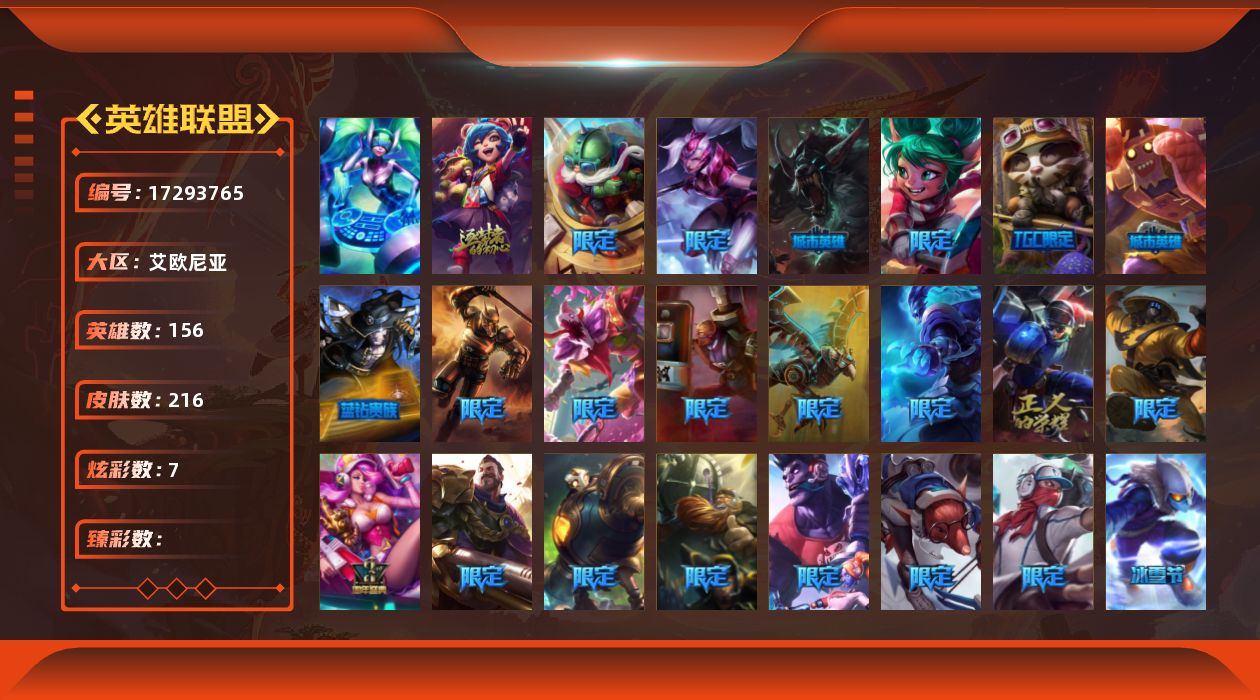 【507911】[17293765]未定级段位-156英雄-216皮肤-7炫彩-1终极-1神话-38限定-22传说-71史诗【神话皮肤】:十周年纪念安妮【冰雪限定】:幸福女神乐芙兰,圣诞开心鬼提莫,圣诞糖果棒厄运小姐,圣诞狂欢基兰,阿木木“主人不要我了”,平安夜女神娑娜,邪恶圣诞老人维迦,夺命美人卡特琳娜,雪默丁格,雪装奈德丽,圣诞玩偶波比,圣诞驯鹿克格莫,冰雪节玛尔扎哈【终极皮肤】:DJ娑娜【