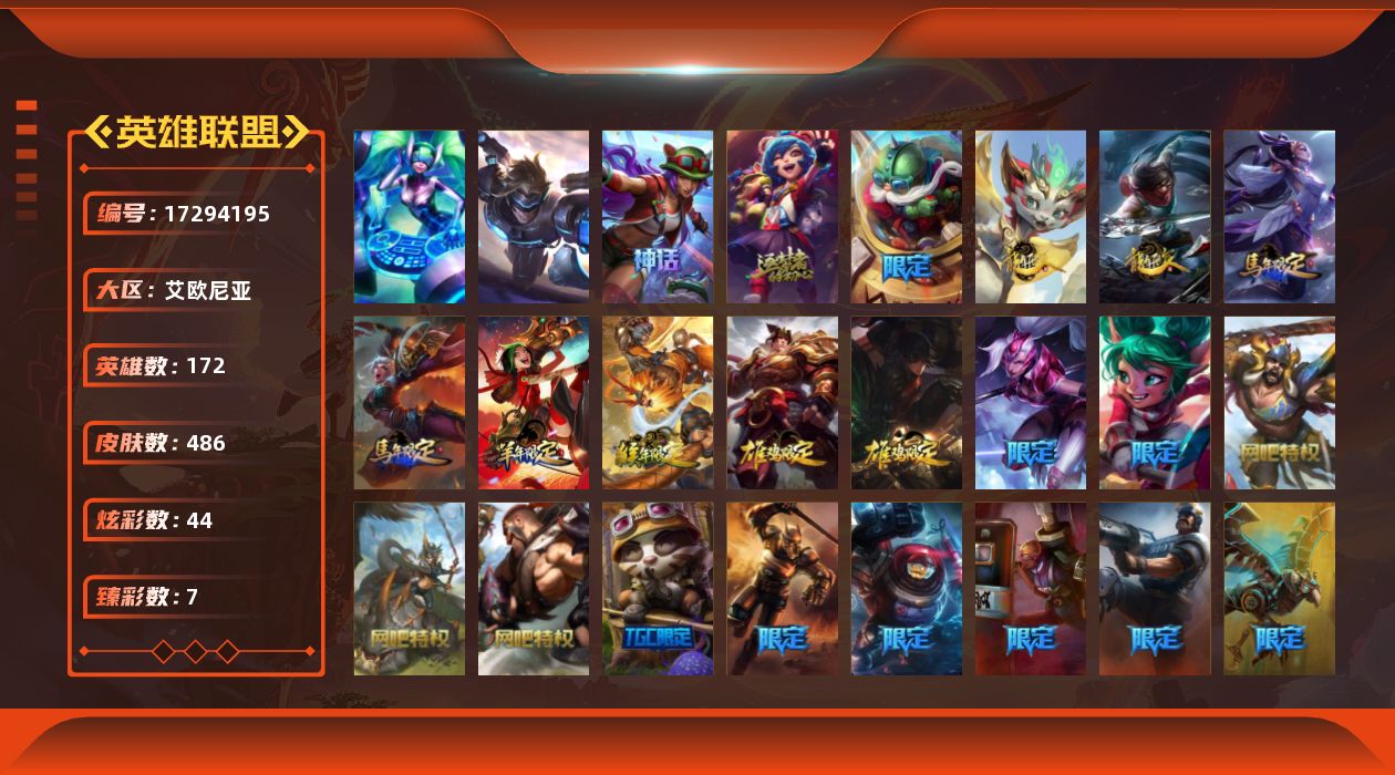 【507975】[17294195]铂金段位-172英雄-486皮肤-44炫彩-2终极-2神话-79限定-36传说-123史诗【神话皮肤】:十周年纪念安妮,十五周年纪念希维尔【臻彩皮肤】:天龙之子卡莎飞龙乘云,墨之影武者亚索金墨耀影,冠军之隐劫凯旋圣装,咖啡甜心璐璐焦糖布丁,幻灵战斗兔锐雯梦幻强袭,魔女阿卡丽虚荣,净雪之月莫甘娜冬虹【年限皮肤】:银龙裁决泰隆,碧玉之牙卡西奥佩娅,替父从军花木兰,