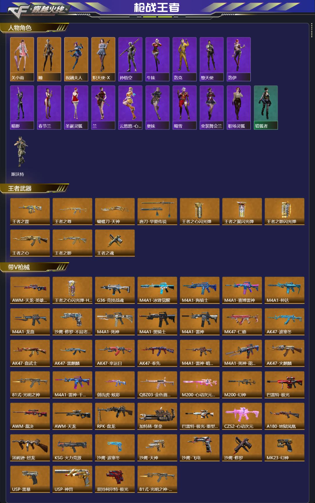 【507982】[17294227]FC-3EX89R苹果QQ,成人号:是,角色等级:103,实名:有修改人脸机会/实名是本人,段位:枪神,VIP等级:V6,V武器数量:304,V角色数量:8,V总数量:184,王者武器数:10,万化数量:249,【人物角色】孙悟空,牛妹,洛克,关小雨,瞳,大老师,堕天使,洛伊,暗影,春节兰,圣诞灵狐,兰,灵狐者,猎狐者,斯沃特,祝融夫人,炽天使-X,武媚-X,