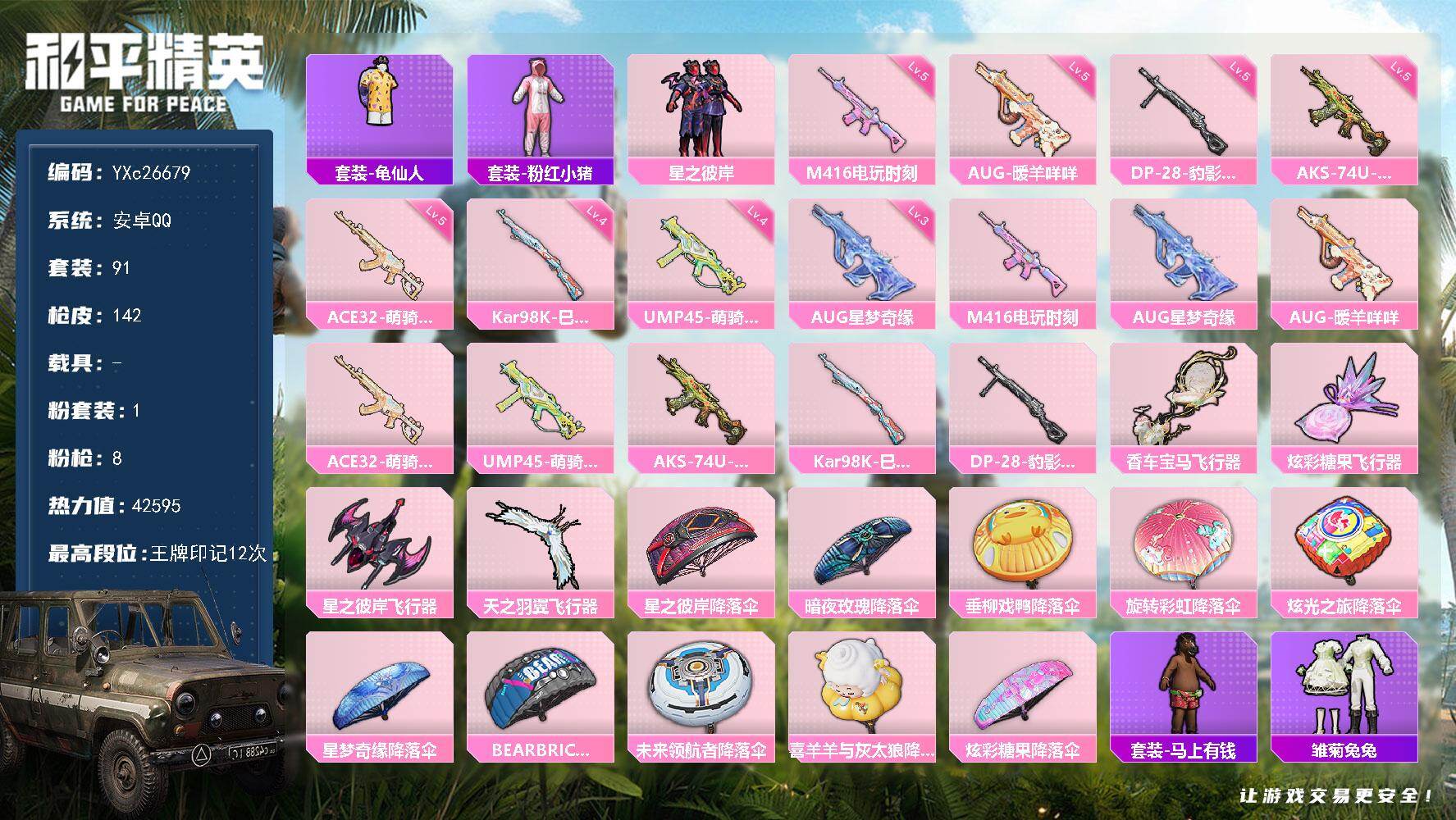 【508083】【不可二次】【安卓QQ】龟仙人 垂柳戏鸭降落伞 迅捷狂鲨 M762-瑞龙福将 星之彼岸降落伞 星之彼岸飞行器 M416-电玩时刻 AUG-星梦奇缘 星之彼岸 粉红小猪 天之羽翼飞行器 瑞龙福将 旋转彩虹降落伞 团圆交子
