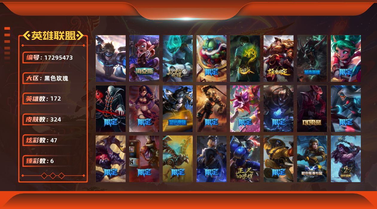 【508148】[17295473]【店主推荐捡漏号】未定级段位-172英雄-324皮肤-47炫彩-1终极-2神话-70限定-23传说-78史诗【臻彩皮肤】:天龙之子卡莎飞龙乘云,赵云子龙炫金将军,战斗学院卡特琳娜盛典礼服,霸天异形卡兹克刹那银光,魔女阿卡丽虚荣,净雪之月莫甘娜冬虹【年限皮肤】:龙的传人李青,碧玉之牙卡西奥佩娅,张辽文远【海克斯皮肤】:海克斯科技安妮【情人节限定】:觅心猎手薇恩【
