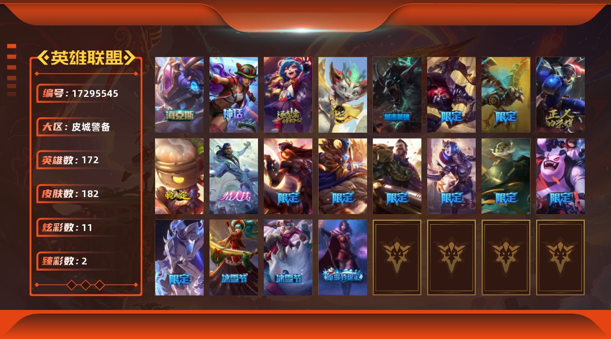 【508155】[17295545]【店主推荐捡漏号】未定级段位-172英雄-182皮肤-11炫彩-0终极-3神话-19限定-17传说-49史诗【珍稀头像】:星守阿狸头像【臻彩皮肤】:无畏骑士瑟庄妮赤子初心,可爱可爱粉红红布里茨【年限皮肤】:天龙之子斯莫德,点心宝贝阿木木【海克斯皮肤】:海克斯科技克格莫【情人节限定】:水晶玫瑰阿克尚【冰雪限定】:幸福女神乐芙兰,阿木木“主人不要我了”,平安夜女神