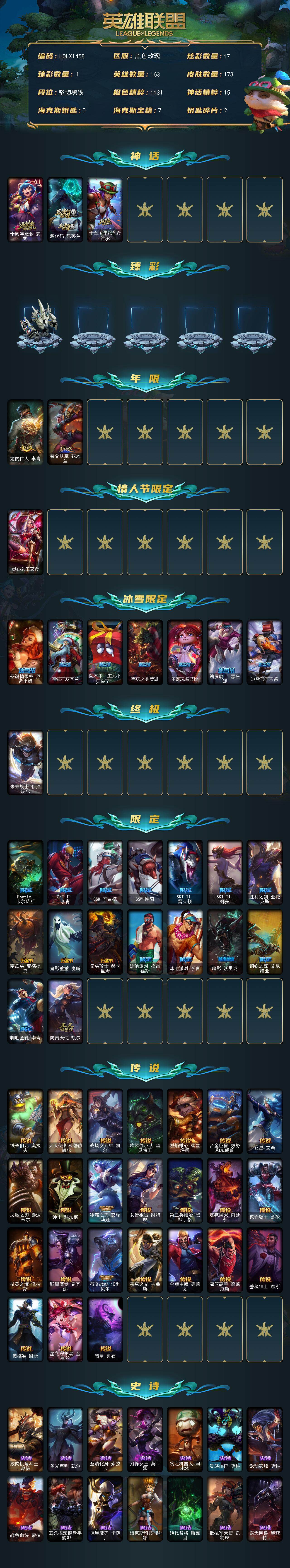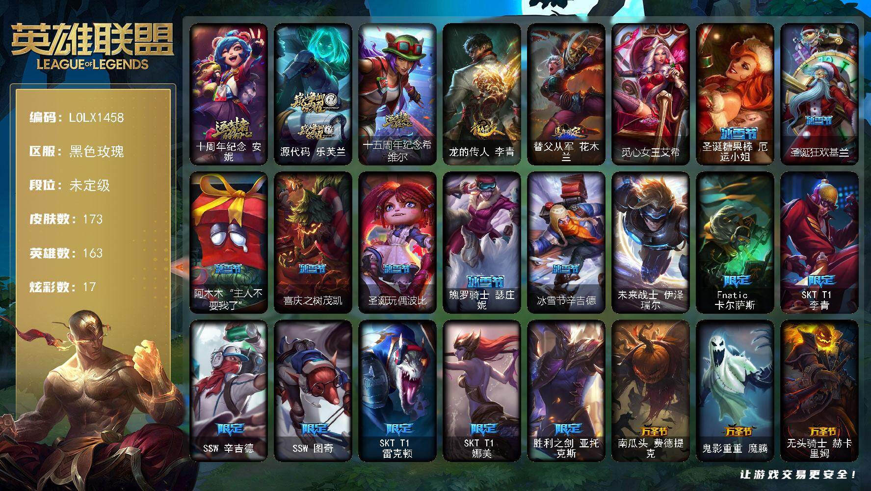 【508290】【LOLX1458】163英雄/173皮肤/1终极/3神话/26限定/1臻彩/17炫彩/24传说/44史诗/未定级/十周年纪念安妮/源代码乐芙兰/十五周年纪念希维尔/霸天巨兽雪崩墨菲特/龙的传人李青/替父从军花木兰/觅心女皇艾希/圣诞糖果棒厄运小姐/圣诞狂欢基兰/阿木木:“主人不要我了”/喜庆之树茂凯/圣诞玩偶波比/魄罗骑士瑟庄妮/冰雪节辛吉德/未来战士伊泽瑞尔/Fnatic卡尔