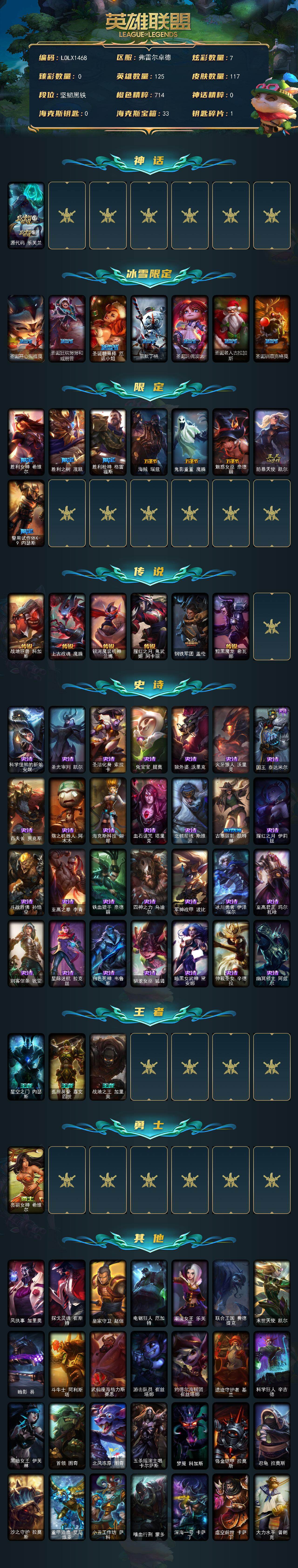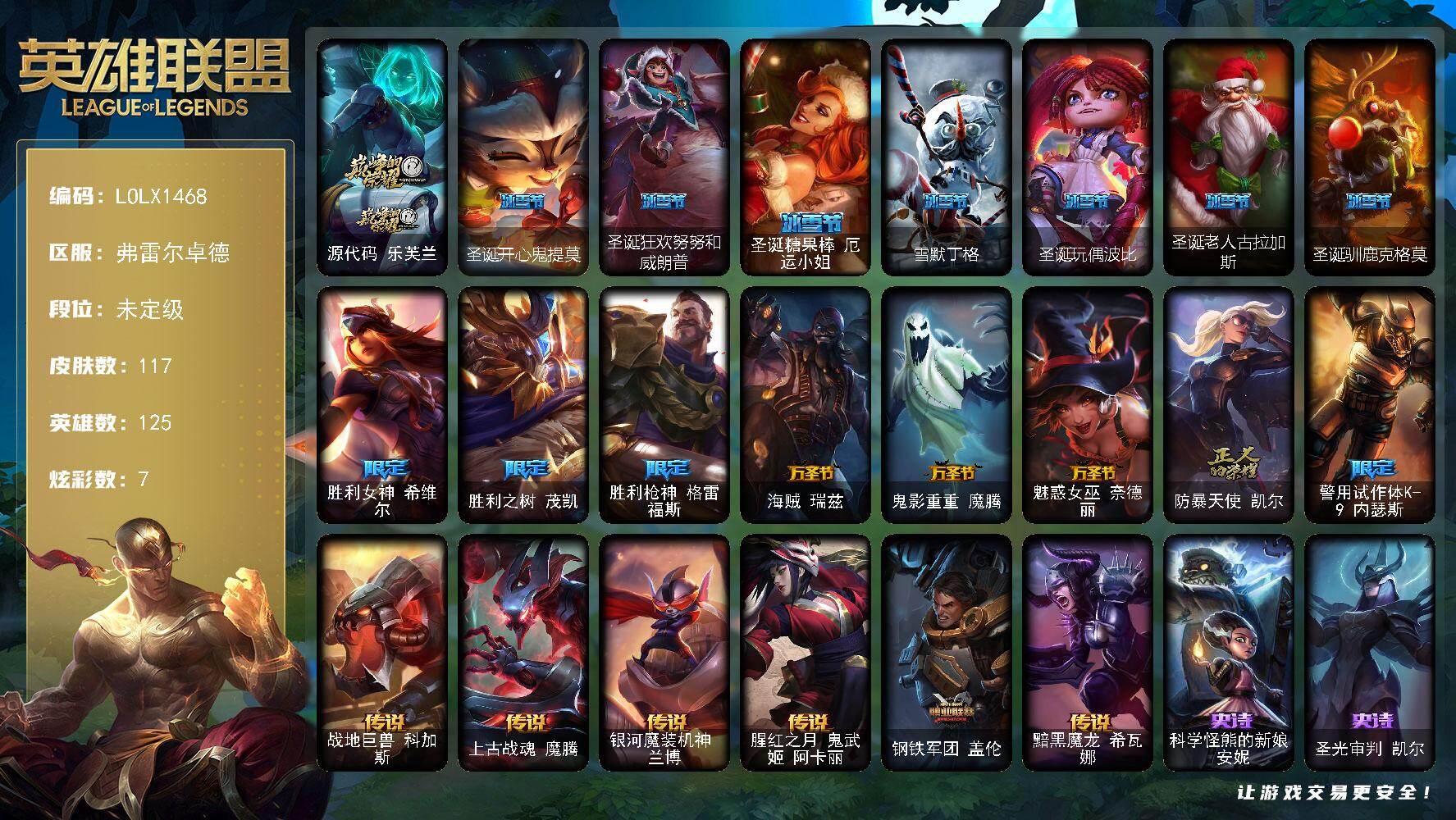【508294】【LOLX1468】125英雄/117皮肤/1神话/15限定/7炫彩/6传说/28史诗/未定级/源代码乐芙兰/圣诞开心鬼提莫/圣诞狂欢努努和威朗普/圣诞糖果棒厄运小姐/雪默丁格/圣诞玩偶波比/圣诞老人古拉加斯/圣诞驯鹿克格莫/胜利女神希维尔/胜利之树茂凯/胜利枪神格雷福斯/海贼瑞兹/鬼影重重魔腾/魅惑女巫奈德丽/防暴天使凯尔/警用试作体K-9内瑟斯/战地巨兽科加斯/上古战魂魔腾/