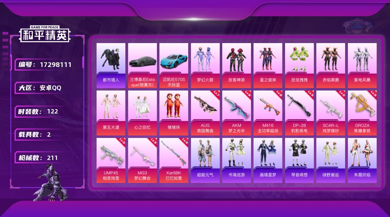 【508412】【不可二次】【安卓QQ】紫电风暴 放客神游 恐龙拽拽 赤焰黑爵 梦幻火箭 AKM-梦之光华 UMP45-相思残雪 GROZA-焦糖拿铁 兰博轿车灰色 迈凯伦570S 天际蓝
