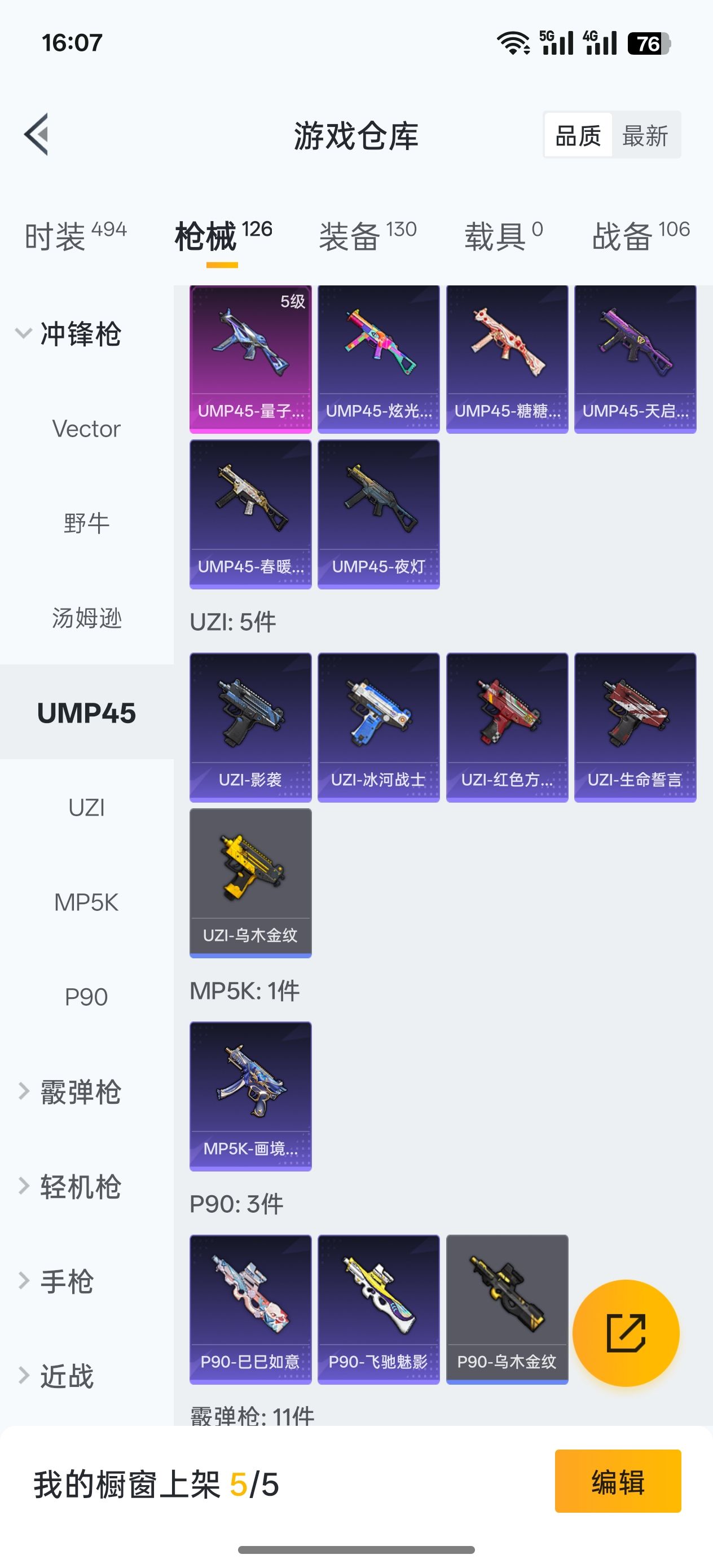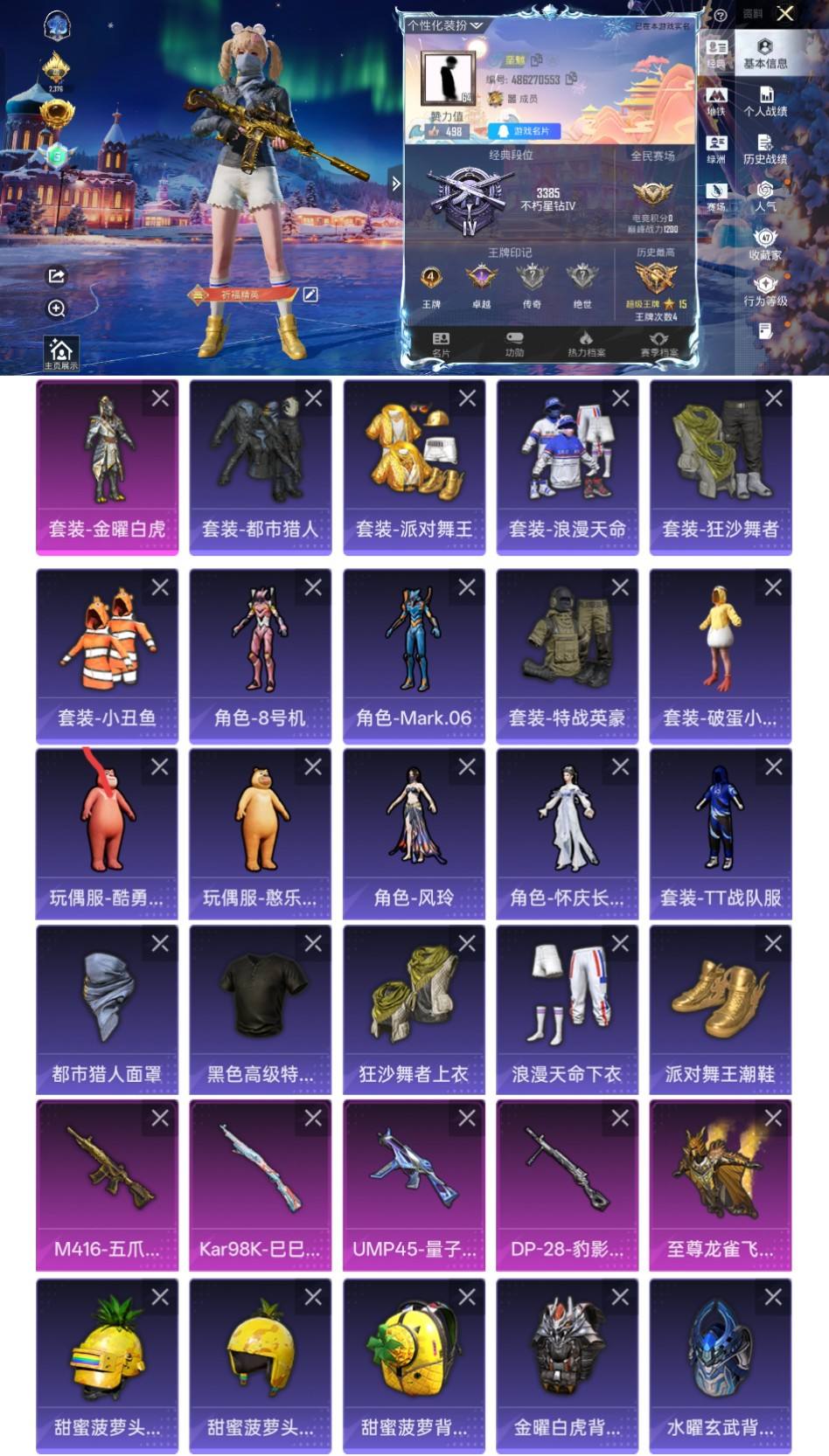 【508706】【可二次】【安卓QQ】UMP45-量子极限 M416-五爪金龙 金曜白虎 漫步者 都市猎人 金耀白虎 派对舞王 至尊龙雀飞行服 狂沙舞者 极速红龙 浪漫天命 雪山精英