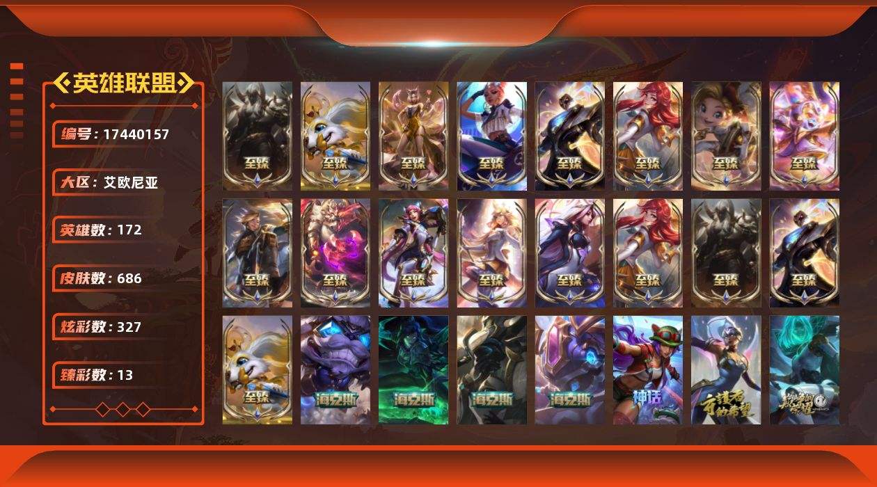 【530066】[17440157]铂金段位-172英雄-686皮肤-327炫彩-0终极-26神话-98限定-65传说-156史诗【神话皮肤】:十周年纪念安妮,源代码乐芙兰,十五周年纪念希维尔,神凰行者瑞羽圣凰艾尼维亚,黎明使者卡尔玛,海克斯科技吉格斯,海克斯科技克格莫,零之枪骑赫卡里姆,摄魂使者薇恩,至臻真实伤害奇亚娜,至臻奥术师佐伊,至臻幻灵战斗猫金克丝,至臻绝息圣堂厄运小姐,至臻KDA阿狸