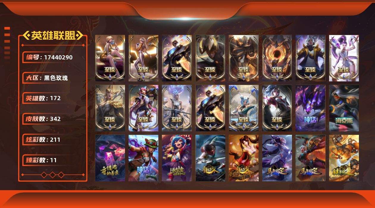 【530145】[17440290]未定级段位-172英雄-342皮肤-211炫彩-0终极-19神话-43限定-41传说-77史诗【神话皮肤】:十周年纪念安妮,十五周年纪念希维尔,暗星科加斯,水晶掠夺者卡兹克,新创战纪希维尔,至臻真实伤害亚索,至臻暗星墨菲特,至臻海珀利安小队X09星环灵风迦娜,至臻黑夜使者李青,至臻幻灵战斗猫金克丝,至臻KDAALLOUT卡莎,至臻KDA卡莎,至臻KDA伊芙琳,