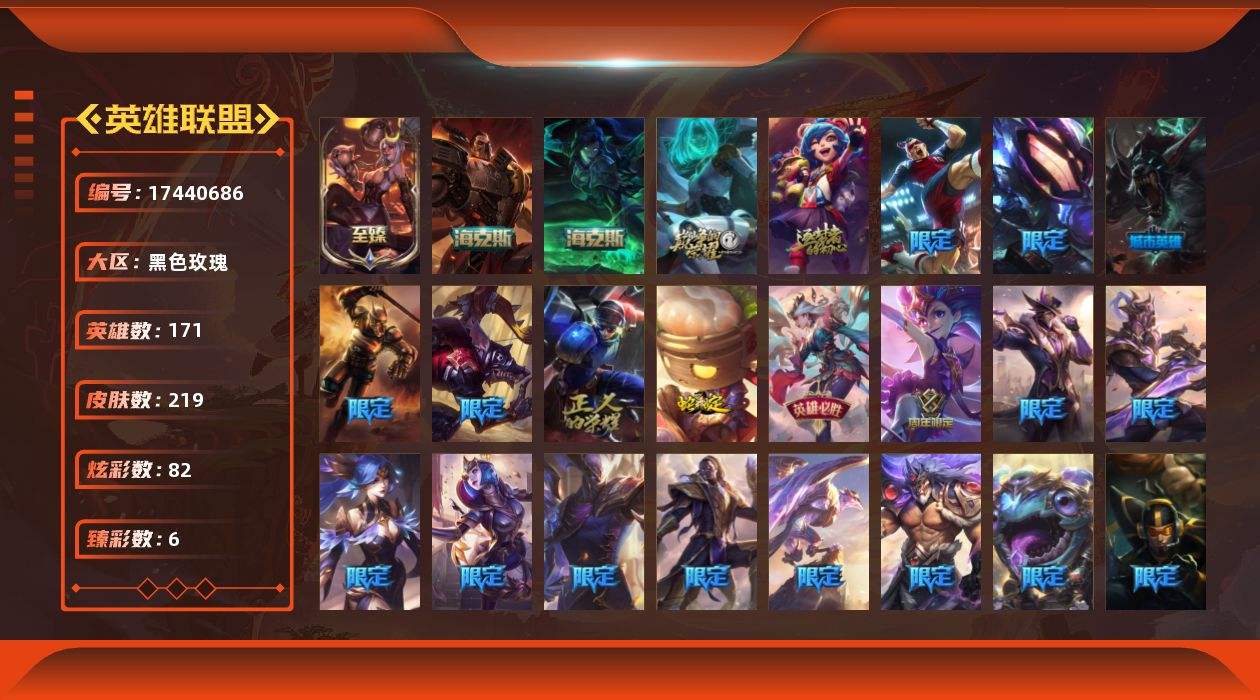 【530302】[17440686]铂金段位-171英雄-219皮肤-82炫彩-0终极-5神话-27限定-22传说-50史诗【神话皮肤】:十周年纪念安妮,源代码乐芙兰,恐惧新星德莱厄斯,摄魂使者薇恩,至臻烈焰美人薇恩【至臻皮肤】:至臻烈焰美人薇恩【臻彩皮肤】:无畏骑士瑟庄妮赤子初心,幻灵战斗猫金克丝梦幻强袭,星之守护者阿卡丽热情之光,魔女阿卡丽虚荣,净雪之月莫甘娜冬虹,黑夜使者嘉文四世白夜【年限