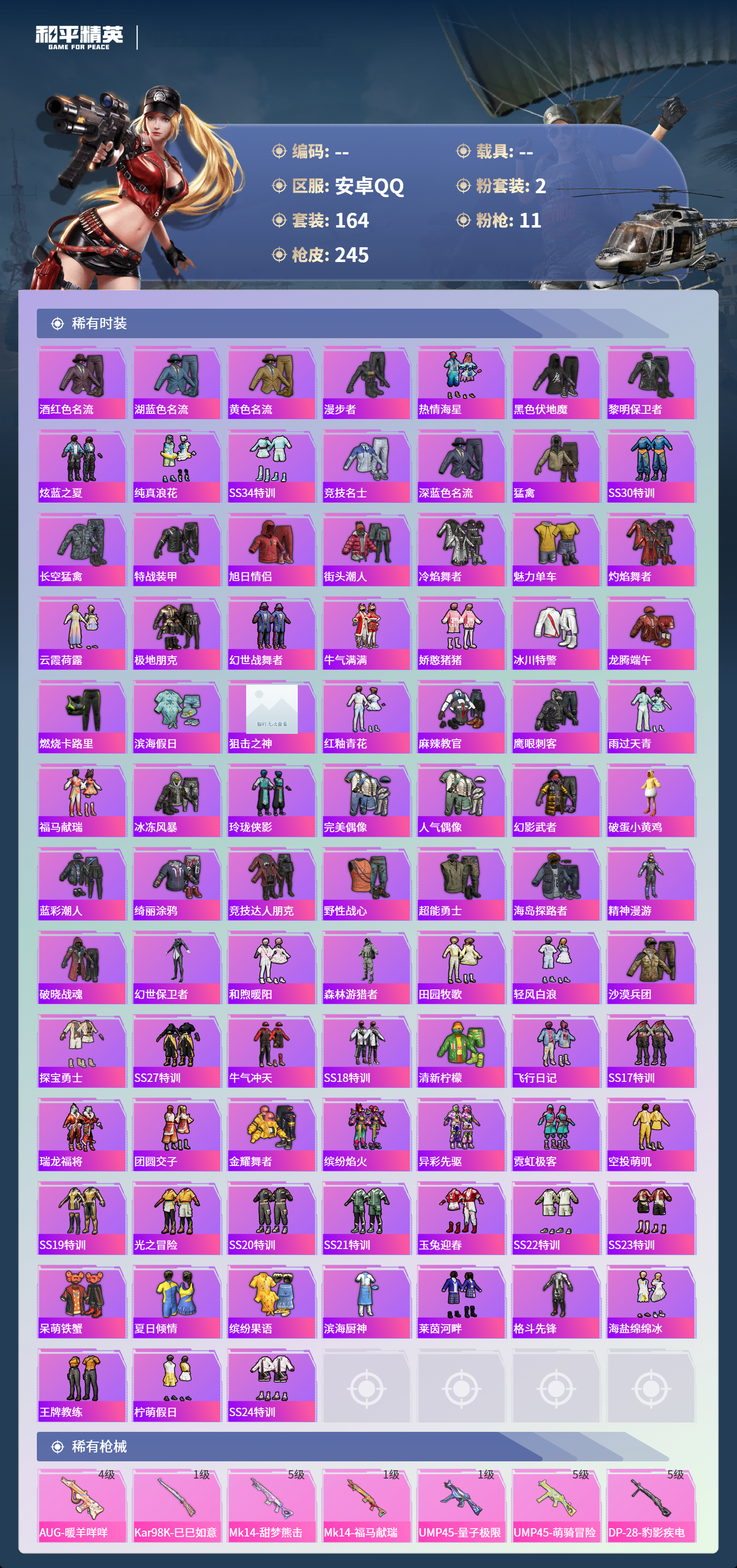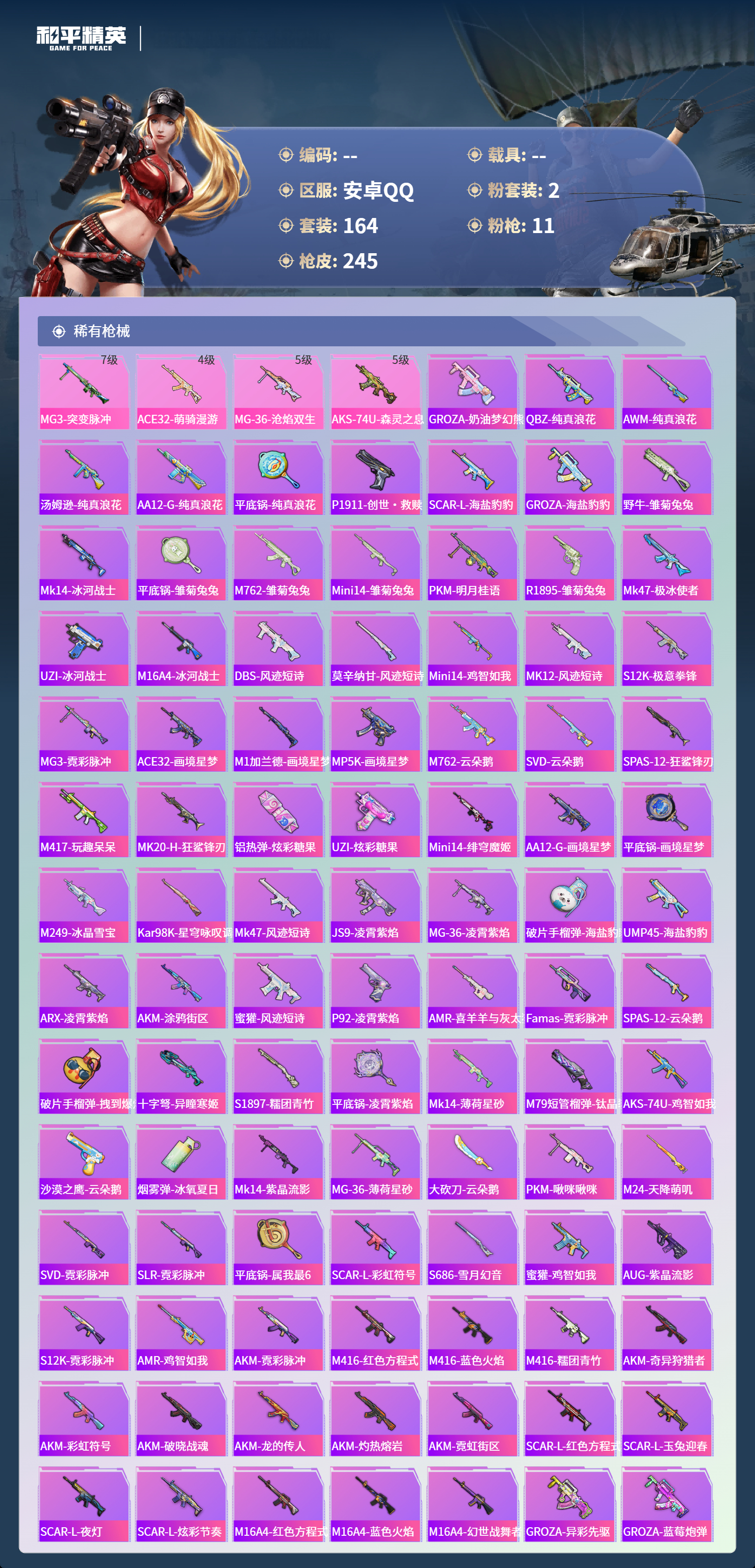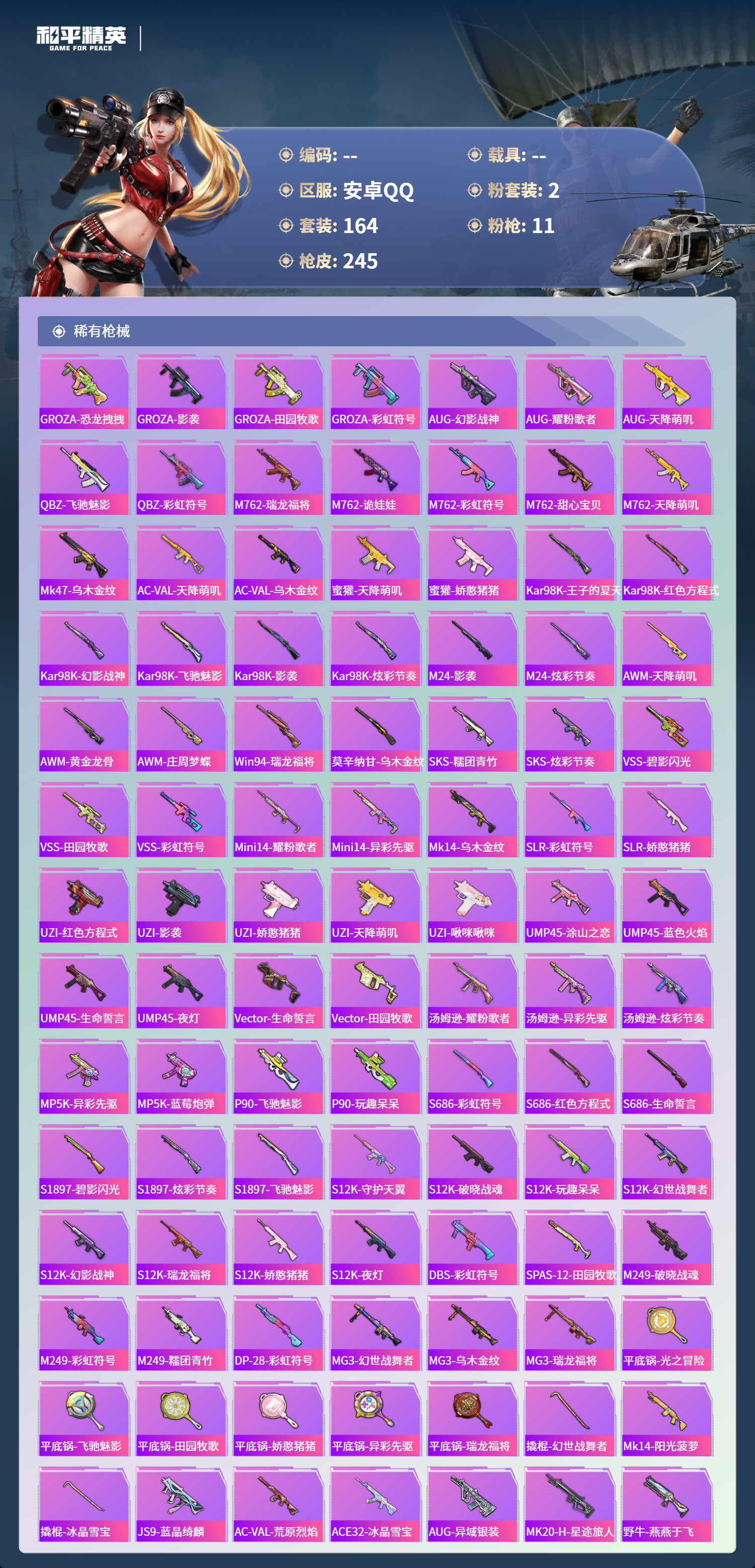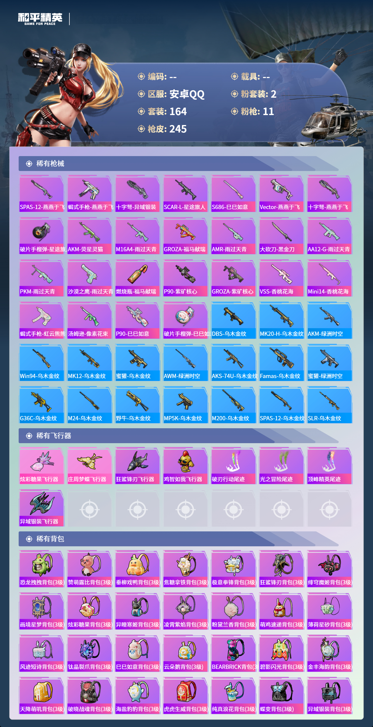【590551】【可二次】【安卓QQ】龟仙人 MG3-突变脉冲 漫步者 M762-瑞龙福将 豚鼠丹丹 金羽特工 庄周梦蝶飞行器 UMP45-量子极限 星之彼岸 瑞龙福将 暗影哥特 AWM-黄金龙骨 团圆交子 AKM-奇异狩猎者