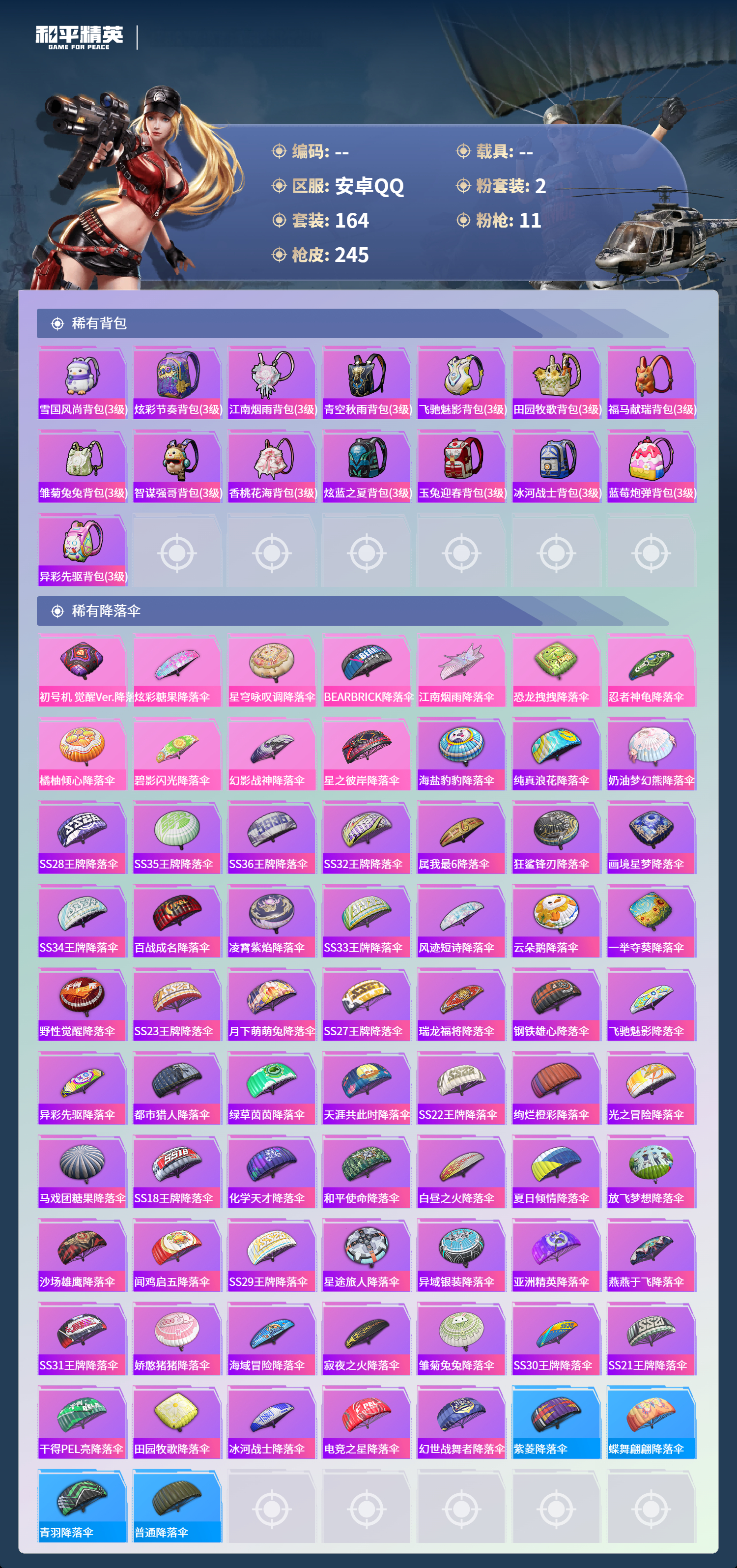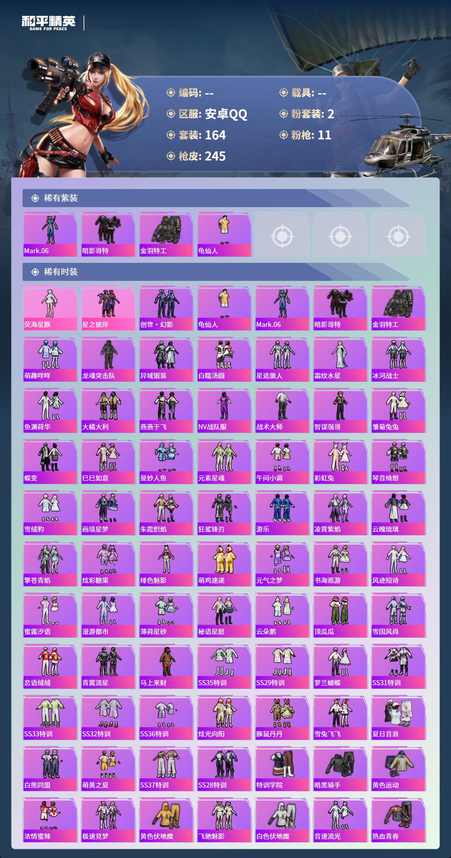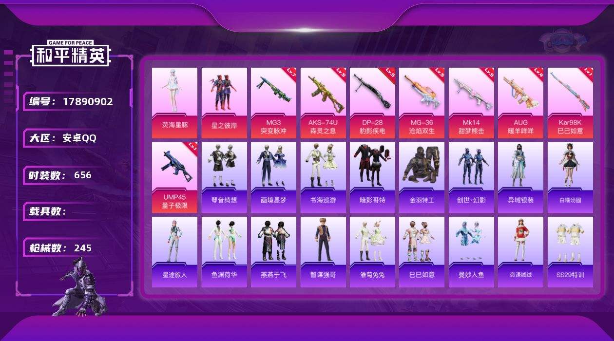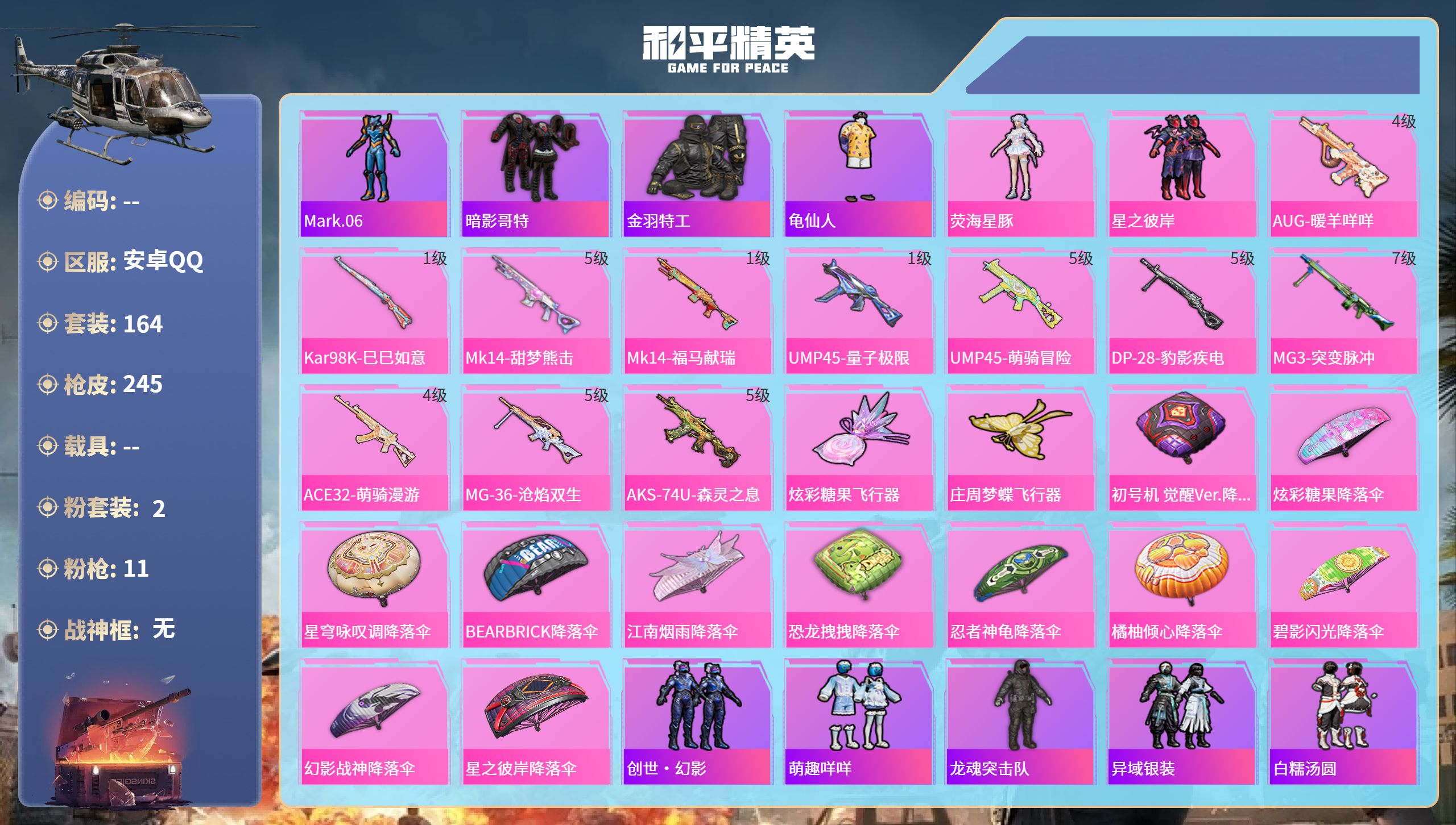 【590551】【可二次】【安卓QQ】龟仙人 MG3-突变脉冲 漫步者 M762-瑞龙福将 豚鼠丹丹 金羽特工 庄周梦蝶飞行器 UMP45-量子极限 星之彼岸 瑞龙福将 暗影哥特 AWM-黄金龙骨 团圆交子 AKM-奇异狩猎者