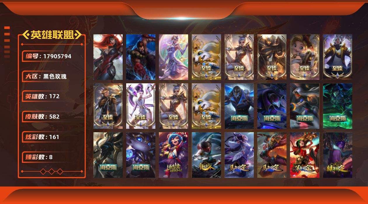 【592378】[17905794]未定级段位-172英雄-582皮肤-161炫彩-3终极-17神话-90限定-65传说-140史诗【神话皮肤】:十周年纪念安妮,神凰行者瑞羽圣凰艾尼维亚,海克斯科技波比,海克斯科技卡萨丁,海克斯科技魔腾,零之枪骑赫卡里姆,摄魂使者薇恩,新创战纪希维尔,至臻真实伤害亚索,至臻奥术师佐伊,至臻KDAALLOUT卡莎,至臻灵能特工伊泽瑞尔,至臻绒毛菲兹,至臻绒毛菲兹2