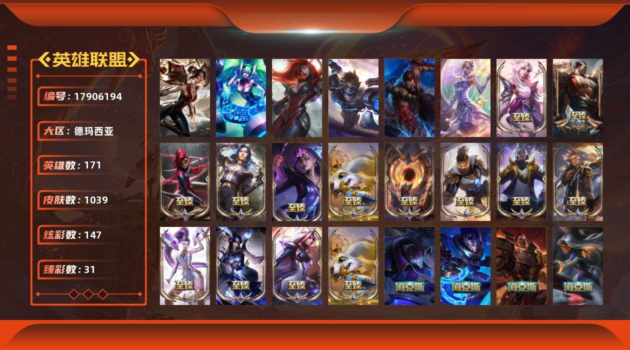 【592416】[17906194]未定级段位-171英雄-1039皮肤-147炫彩-5终极-34神话-169限定-87传说-196史诗【神话皮肤】:十周年纪念安妮,十五周年纪念希维尔,暗星科加斯,殿堂传奇薇恩,灰烬杀手塞拉斯,海克斯科技阿利斯塔,海克斯科技阿木木,海克斯科技安妮,海克斯科技波比,海克斯科技嘉文四世,海克斯科技拉莫斯,海克斯科技雷克顿,海克斯科技玛尔扎哈,海克斯科技魔腾,海克斯科