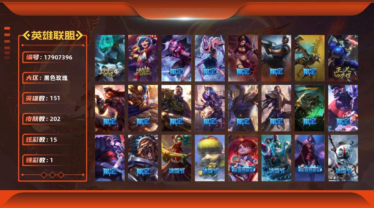 【592510】[17907396]未定级段位-151英雄-202皮肤-15炫彩-0终极-2神话-28限定-17传说-57史诗【神话皮肤】:十周年纪念安妮,源代码乐芙兰【臻彩皮肤】:冠军典狱长锤石凯旋圣装【冰雪限定】:幸福女神乐芙兰,圣诞开心鬼提莫,平安夜女神娑娜,英勇玩具兵普朗克,邪恶圣诞老人维迦,喜庆之树茂凯,雪默丁格,圣诞玩偶波比【限定皮肤】:Fnatic卡尔萨斯,暗杀星蒙多,暗杀星慎,S