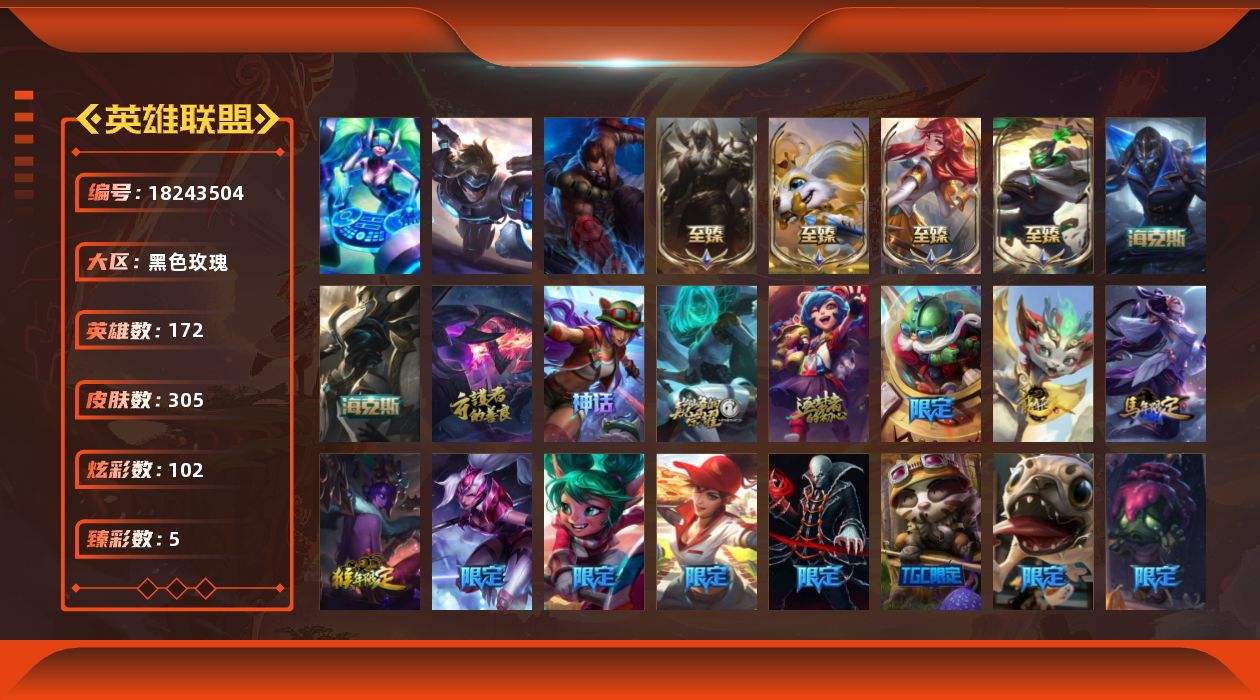 【637866】[18243504]可二次【特价出售/店主推荐】黄金段位-172英雄-305皮肤-102炫彩-3终极-11神话-55限定-29传说-73史诗【热门头像】:觅心之翼奎因头像【至臻皮肤】:至臻征服者贾克斯,至臻战斗学院拉克丝,至臻绒毛菲兹,至臻腥红之月亚托克斯【臻彩皮肤】:冠军典狱长锤石凯旋圣装,星之守护者萨勒芬妮未来之光,霸天巨兽雪崩墨菲特,玉剑传说苍鸾丁香,心之钢伊泽瑞尔锐意曲风