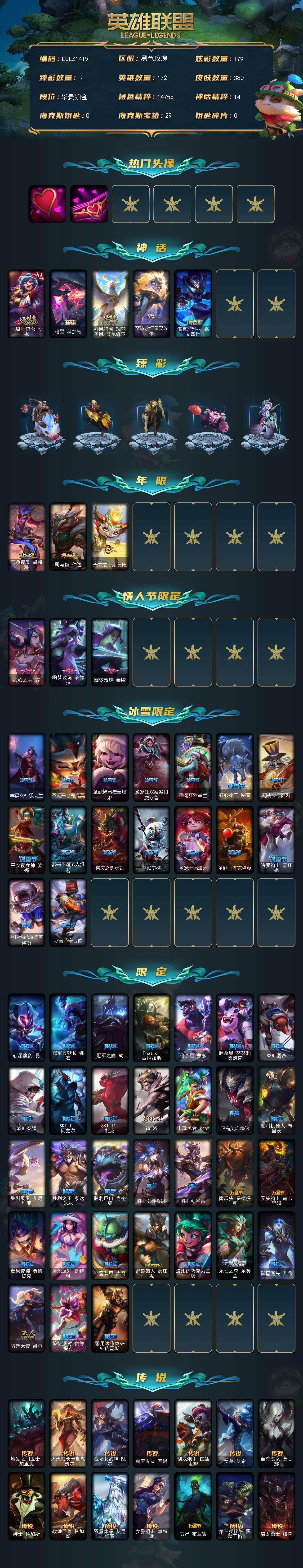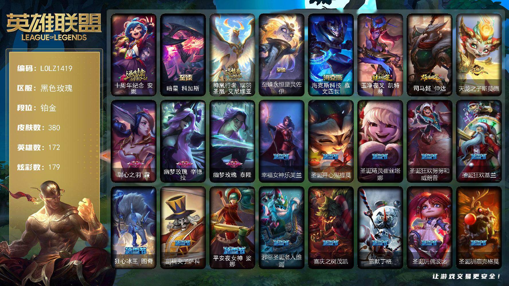 【637902】【LOLZ1419】172英雄/380皮肤/5神话/54限定/9臻彩/179炫彩/29传说/79史诗/铂金账号等级:492/爱意绵绵/爱情之歌/十周年纪念安妮/暗星科加斯/神凰行者瑞羽凤凰艾尼维亚/至臻永恒星灵佐伊/海克斯科技嘉文四世/天龙之子卡莎飞龙乘云/无畏骑士瑟庄妮赤子初心/征服者韦鲁斯炫金/冠军之隐劫凯旋圣装/可爱可爱粉红红布里茨/魔女阿卡丽虚荣/净雪之月莫甘娜冬虹/这货