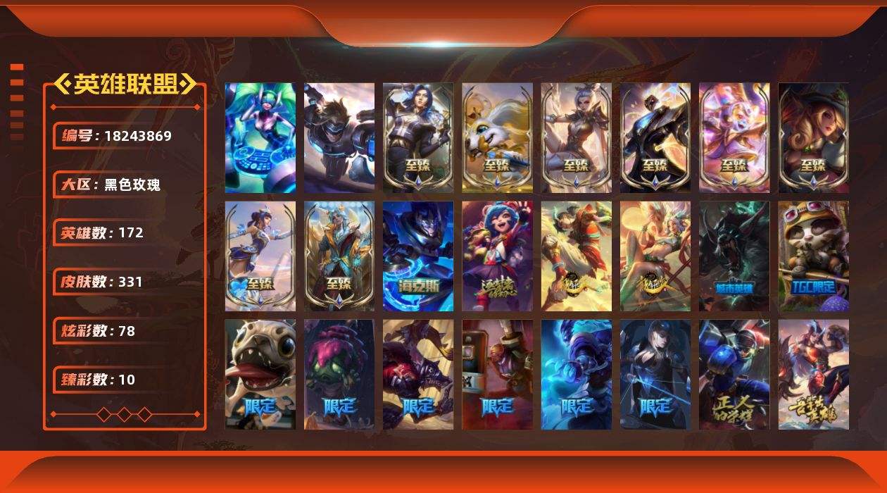 【637934】[18243869]未定级段位-172英雄-331皮肤-78炫彩-2终极-10神话-43限定-34传说-83史诗【神话皮肤】:十周年纪念安妮,海克斯科技嘉文四世,至臻天龙之子伊泽瑞尔,至臻魅惑女巫莫甘娜,至臻青花瓷拉克丝,至臻绒毛菲兹,至臻太空律动节奏幻师璐璐,至臻未来战士锤石,至臻玉剑传说武剑仙【热门头像】:觅心之翼奎因头像【至臻皮肤】:至臻魅惑女巫莫甘娜,至臻双城之战2指挥官