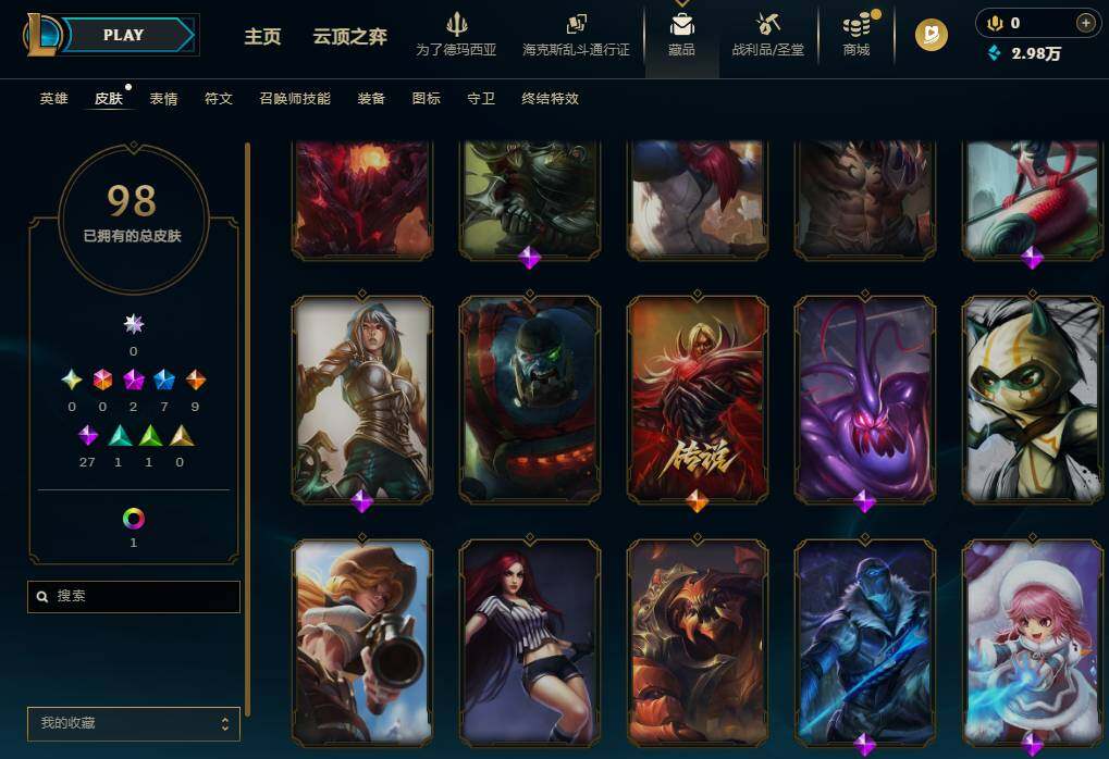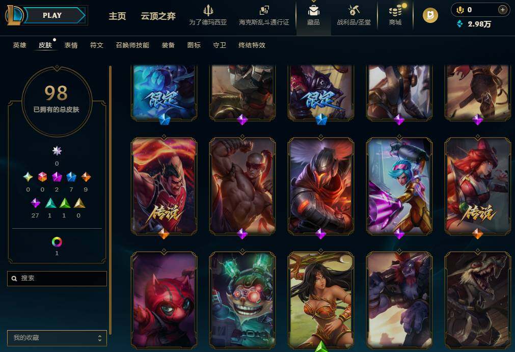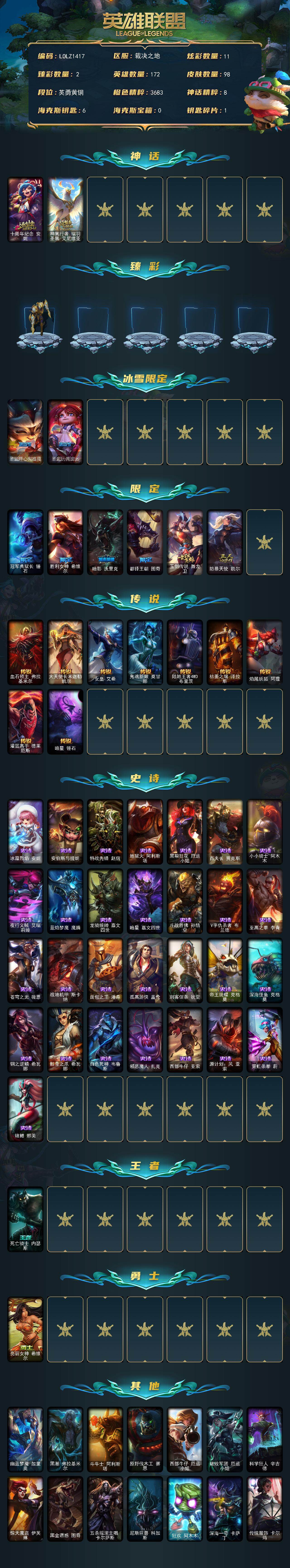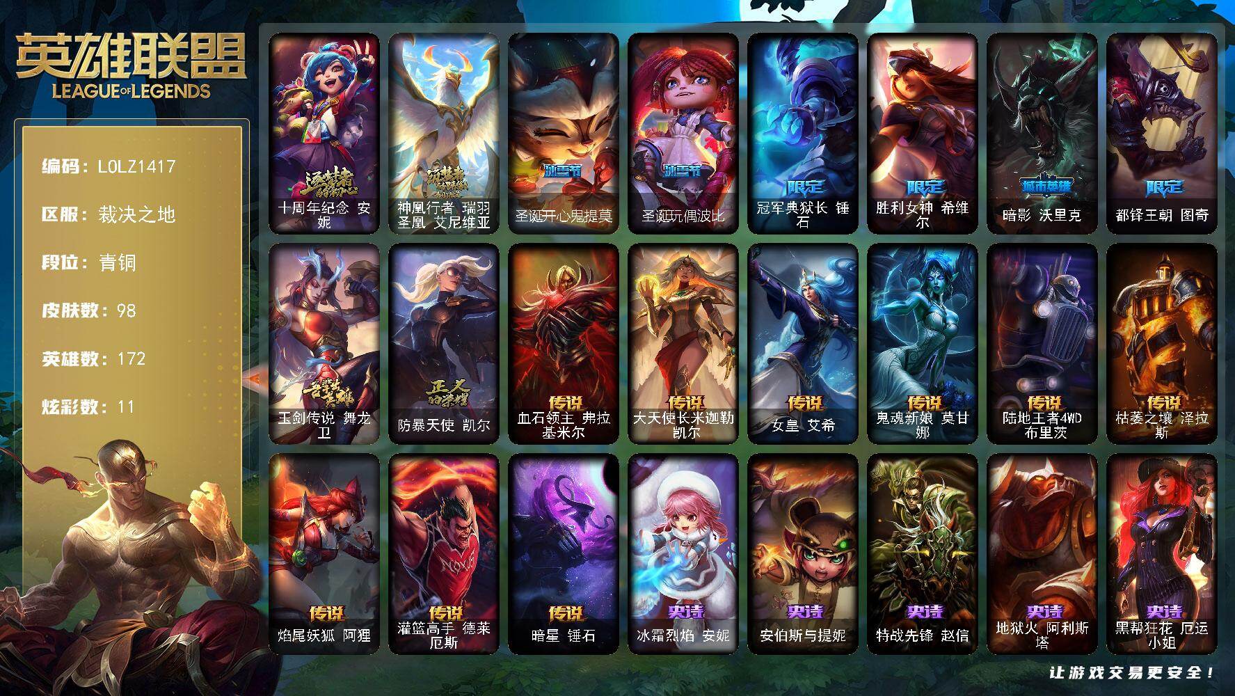 【637947】【LOLZ1417】172英雄/98皮肤/2神话/8限定/2臻彩/11炫彩/9传说/29史诗/青铜/十周年纪念安妮/神凰行者瑞羽凤凰艾尼维亚/冠军之隐劫凯旋圣装/圣诞开心鬼提莫/圣诞玩偶波比/冠军典狱长锤石/胜利女神希维尔/暗影妖狐阿狸/都铎王朝图奇/玉剑传说舞龙卫/防暴天使凯尔/血石领主弗拉基米尔/大天使长米迦勒凯尔/女皇艾希/鬼魂新娘莫甘娜/陆地王者4WD布里茨/枯萎之壤泽拉