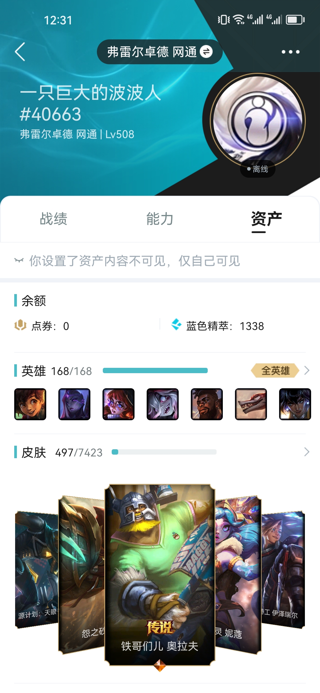 [4142619]Xr31900-游戏区服:网通弗雷尔卓德-情况:可二次-死钱包- 皮肤总数: 439 英雄数: 168 终极:2 神话:16 限定:80 传说:40 史诗:126 至臻: 至臻 源计划:正义 艾瑞莉娅,至臻 王国机神玄武 盖伦,至臻 黑夜使者 李青,至臻 玉剑传说 武剑仙,至臻 电玩女神 凯特琳,至臻 绒毛菲兹,至臻 电玩女神 凯特琳(2022),至臻 黑夜...