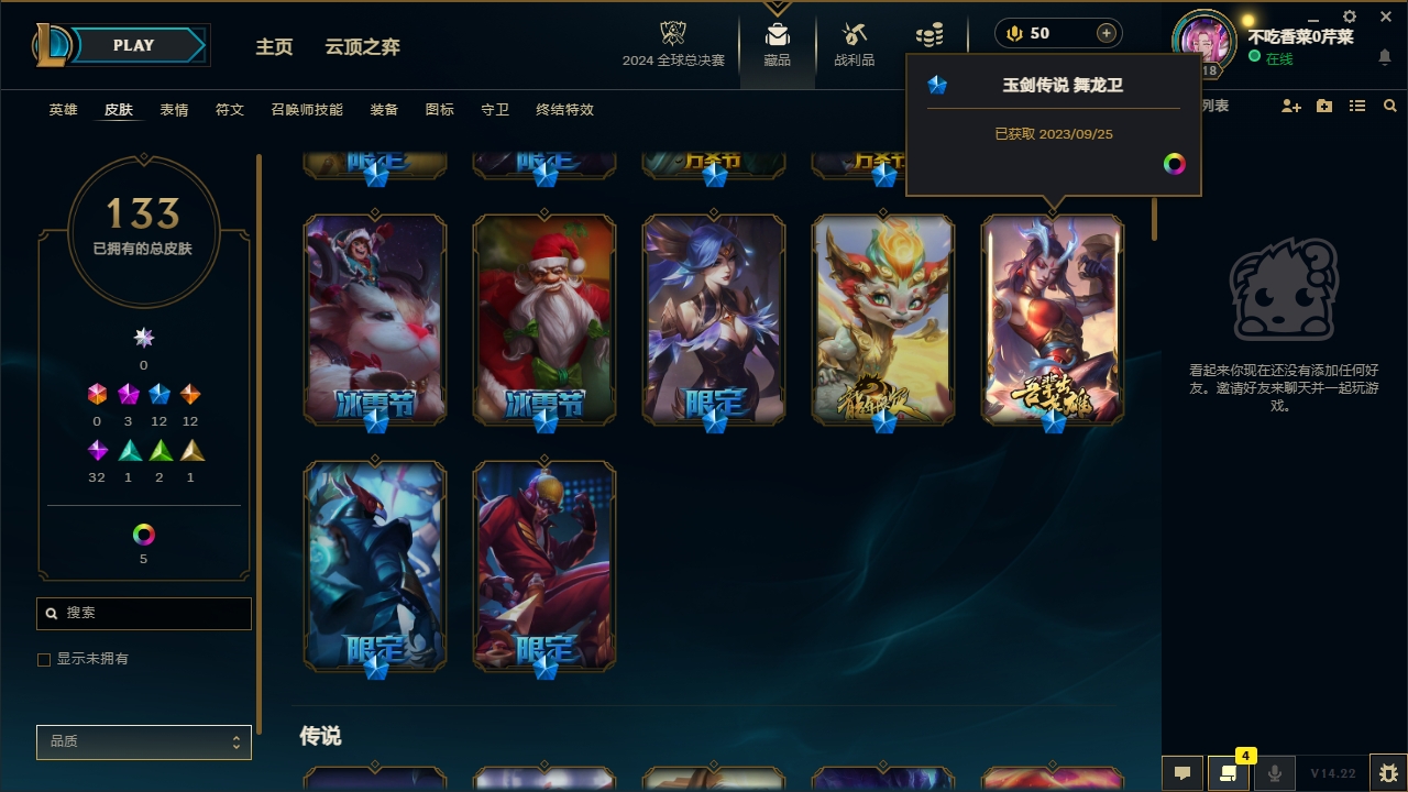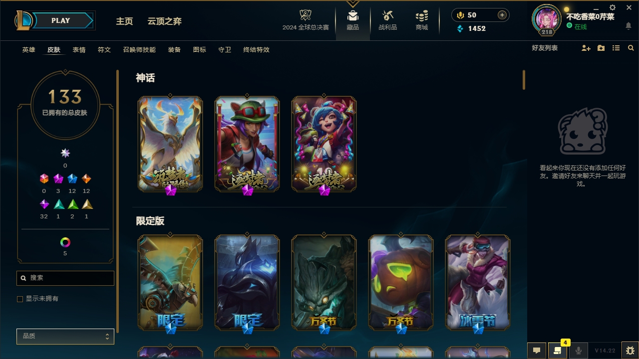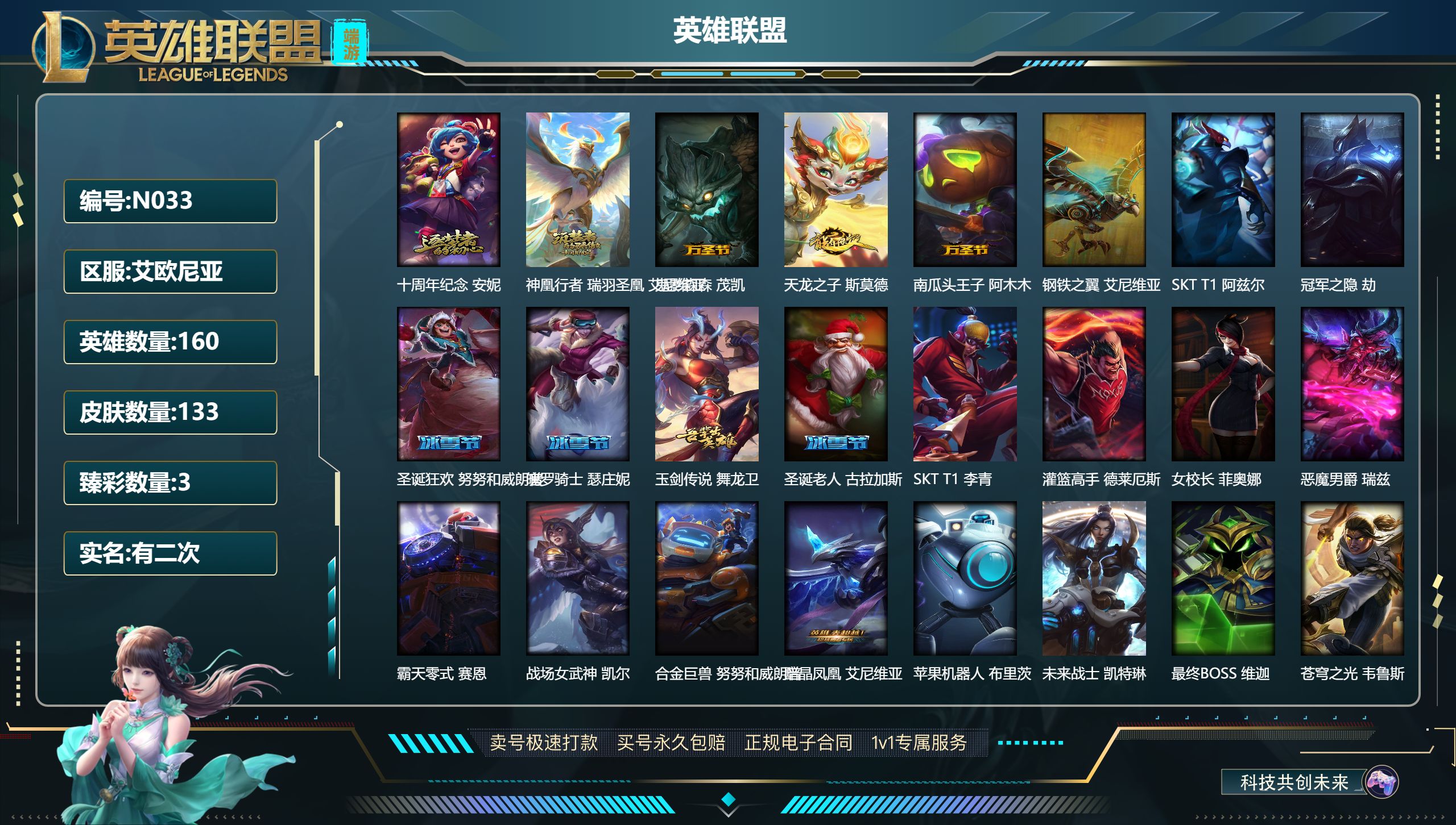 160英雄-133皮肤-十周年纪念 安妮 神凰行者 瑞羽圣凰 艾尼维亚 鬼影森森 茂凯 天龙之子 斯莫德 南瓜头王子 阿木木 钢铁之翼 艾尼维亚 SKT T1 阿兹尔 冠军之隐 劫 圣诞狂欢 努努和威朗普 魄罗骑士 瑟庄妮 玉剑传说 舞龙卫 圣诞老人 古拉加斯 SKT T1 李青 灌篮高手 德莱厄斯 女校长 菲奥娜 恶魔男爵 瑞兹 霸天零式 赛...