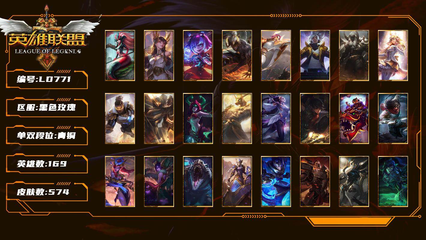 【LD771】169英雄/574皮肤/19神话/90限定/92炫彩/59传说/161史诗/青铜账号等级:520/冰雪风暴希维尔/夺命美人卡特琳娜/魄罗骑士瑟庄妮/圣诞糖果棒厄运小姐/海克斯科技嘉文四世/海克斯科技雷克顿/海克斯科技瑟庄妮/恐惧新星德莱厄斯/零之枪骑赫卡里姆/十周年纪念安妮/摄魂使者薇恩/源代码乐芙兰/至臻福牛守护者菲奥娜/至臻黑...