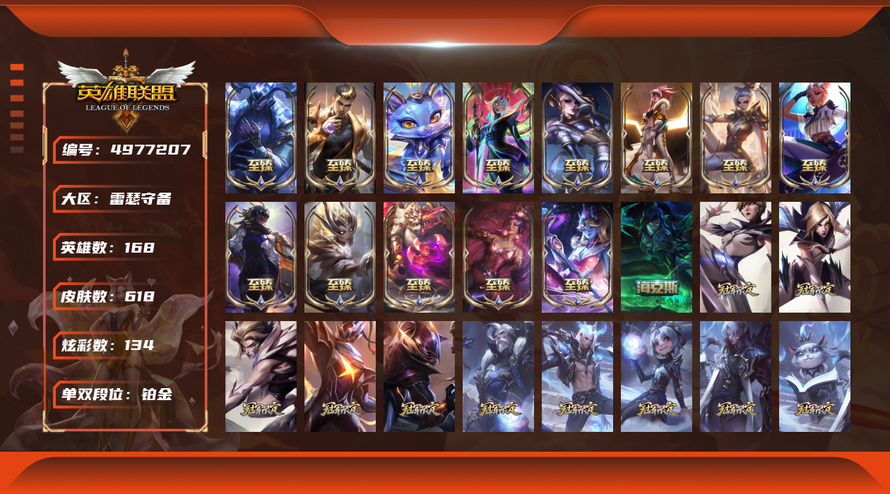 【5673540】[4977207]【gpz_905252】 t14579【雷瑟守备】 618皮肤 134炫彩 17臻彩 26神话/150限定/61传说/168英雄 账号等级:271 云顶神话:4 单双排段位:流光翡翠【重要头像】神龙尊者苍龙艾希手办 至爱的鹿 觅心游侠卢锡安 春晖神女拉克丝 玉剑传说寒潭夭夭炫彩 星守金克丝炫彩 幼犬内瑟斯 幼犬沃里克 西部魔影莎弥拉炫彩 圣
