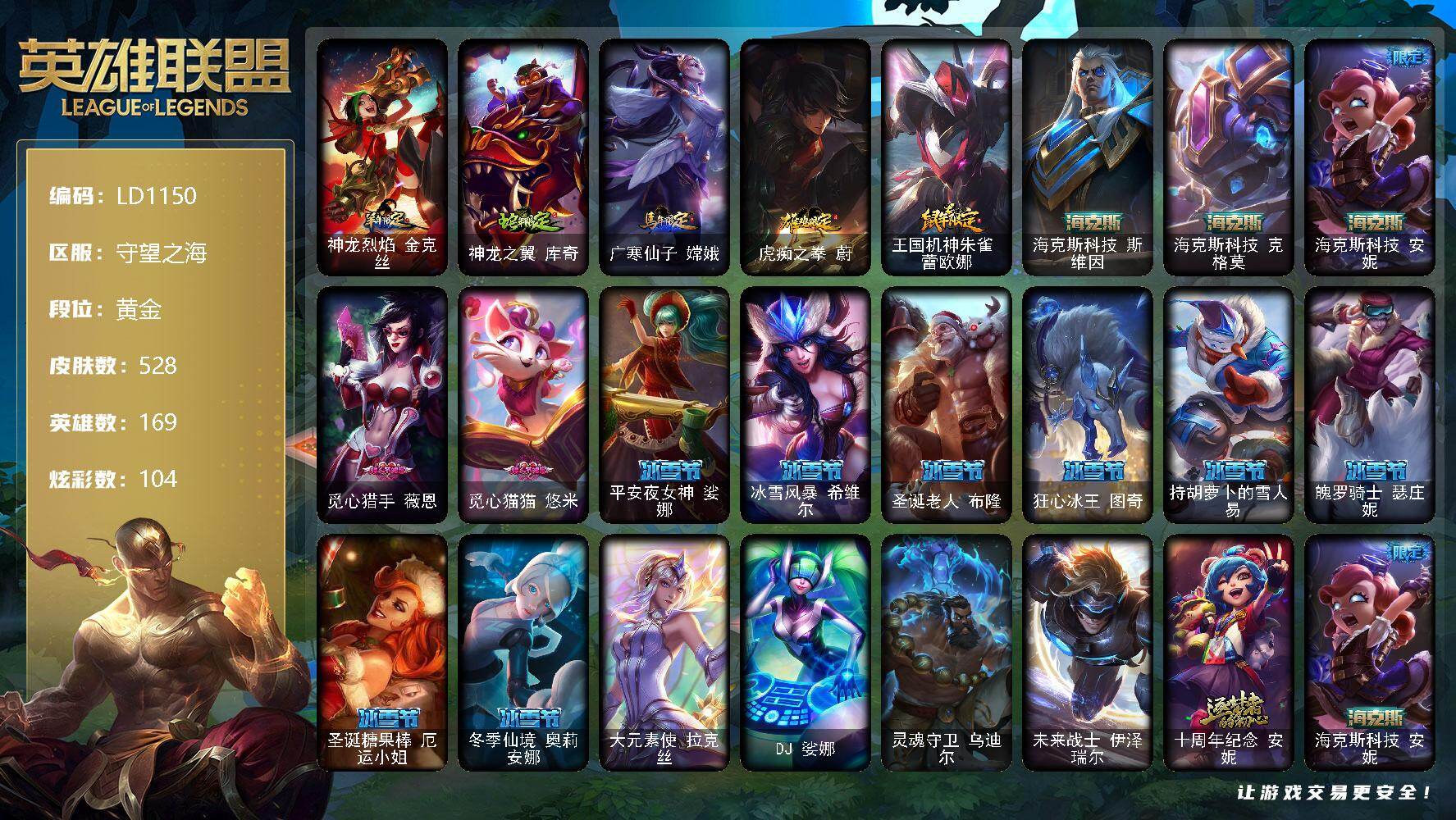 【LD1150】169英雄/528皮肤/4终极/8神话/91限定/9臻彩/104炫彩/54传说/113史诗/黄金账号等级:762/最终BOSS维迦里大魔王/无畏骑士瑟庄妮赤子初心/可爱可爱粉红红布里茨/冠军之隐劫凯旋圣装/净雪之月莫甘娜冬虹/墨之影武者亚索金墨耀影/天龙之子卡莎飞龙乘云/魔女阿卡丽虚荣/心之钢伊泽瑞尔天纵才华/神龙烈焰金克丝/神龙...